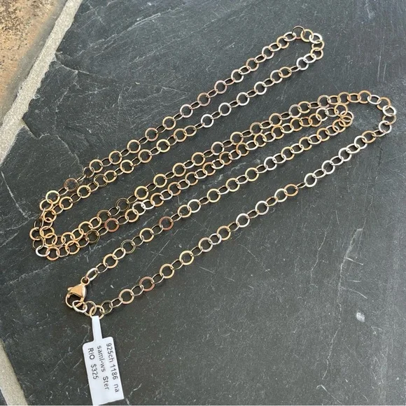 This elegant Sterling Silver 925 Rose gold plated chain, 37” long necklace, links are 5.7mm round flat cable link chain, chain weighs 10.3 grams, new with tags, adds a touch of sophistication to any outfit. Perfect for any occasion.
