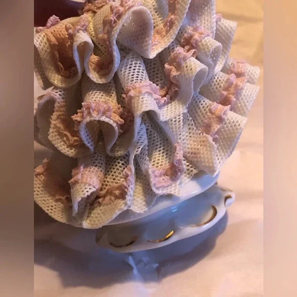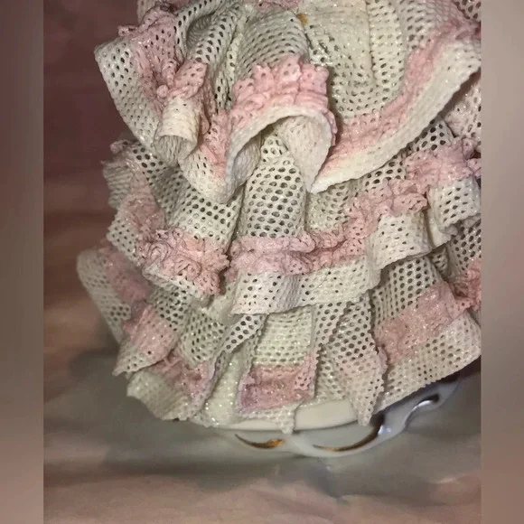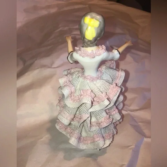She is in fair condition. Missing a few small pieces of lace dress in back. Other than that she is perfect! Beautiful Dresden lace dress. Stands about almost 6” tall. I believe this is a 1950’s piece. Please see all photos. Will be packed and shipped securely. Always open to offers!
