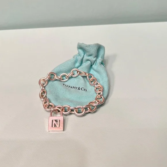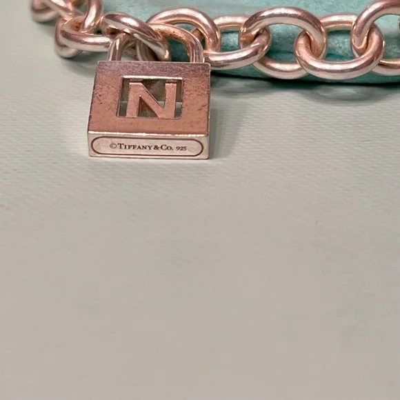 This authentic Tiffany´s letter N alphabet charm bracelet is in good/used condition with some light scratches and scuff marks (see photos). The charm can be used as-is on the Tiffany´s chain link bracelet or it could be used as a pendant on a necklace. This bracelet does not come with a Tiffany´s bag or box, but I will wrap it inside of a white jewelry bag and include a silver cleaning cloth for free!If you like this listing, check out my closet! I´m selling a bunch of old jewelry including Tiffany´s, Jes MaHarry, James Avery, and lots more!