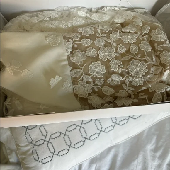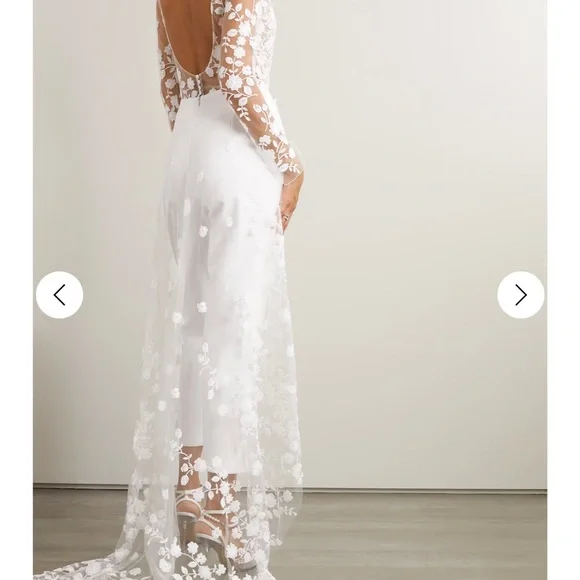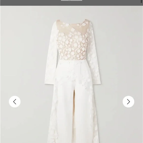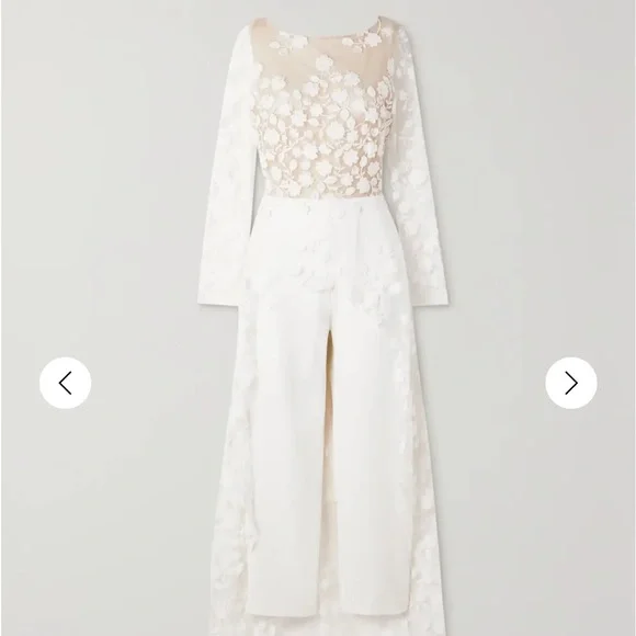 Never used!! New in box! Rime Arodaky´s ´Patsy´ jumpsuit was all over Instagram when it was first released and New York´s Bridal Fashion Week. It has crepe cigarette pants and a beige and white bodice that´s hand-embroidered with lace flowers. Turn to reveal the open back and coordinating train for a stunning Instagram moment as you walk down the aisle.Never used before! It has been sitting in the box. I had ordered this for my wedding, but ended up losing weight and needed to order a smaller size. It is stunning!