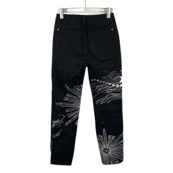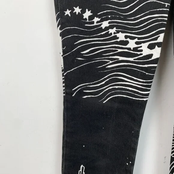 These black denim jeans feature intricate white graphic designs, offering a bold and artistic aesthetic. The button includes branding for a luxurious touch.h14485 36/xs• High-quality denim material• Unique wave and star graphic print• -branded button detail• Front and back pockets• Straight-leg fit