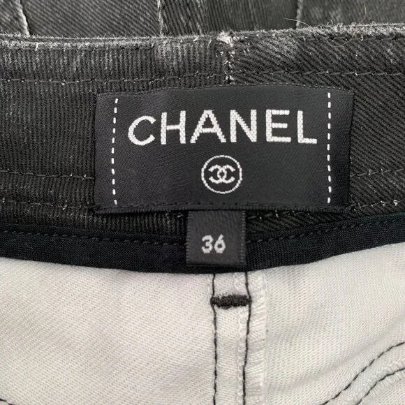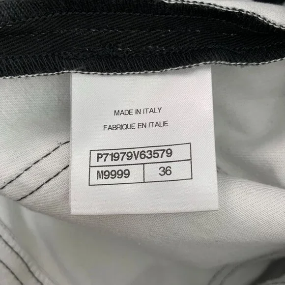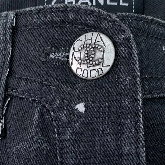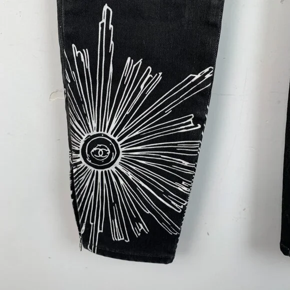 These black denim jeans feature intricate white graphic designs, offering a bold and artistic aesthetic. The button includes branding for a luxurious touch.h14485 36/xs•...