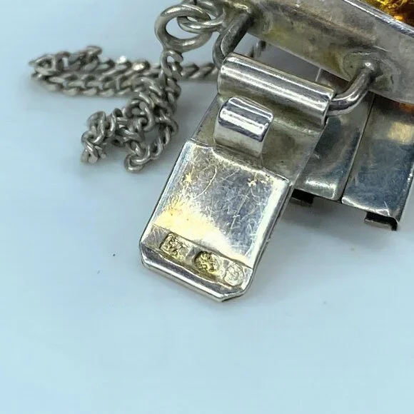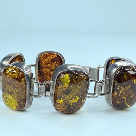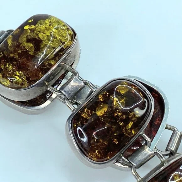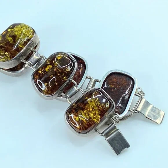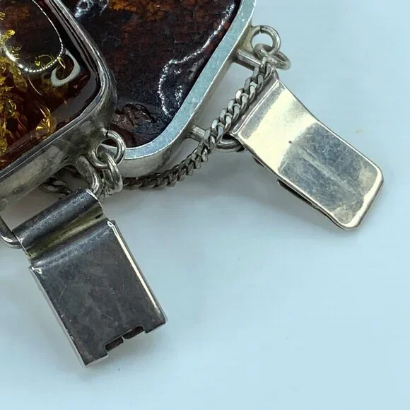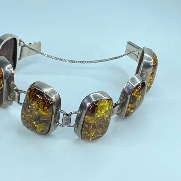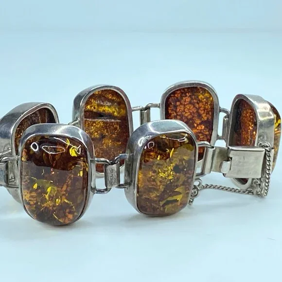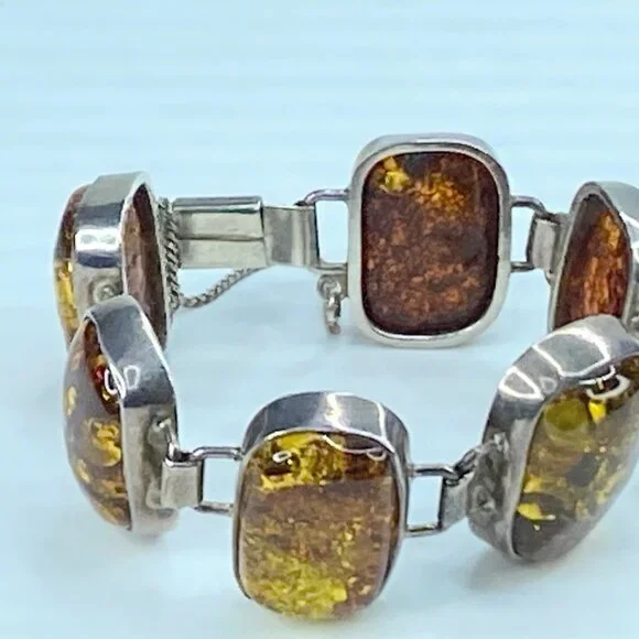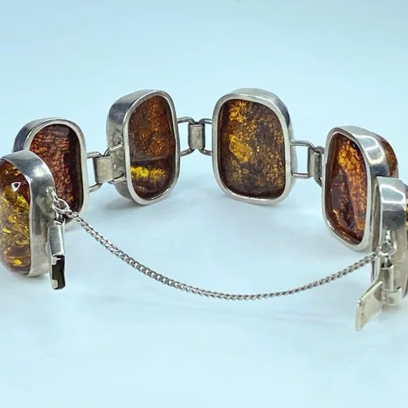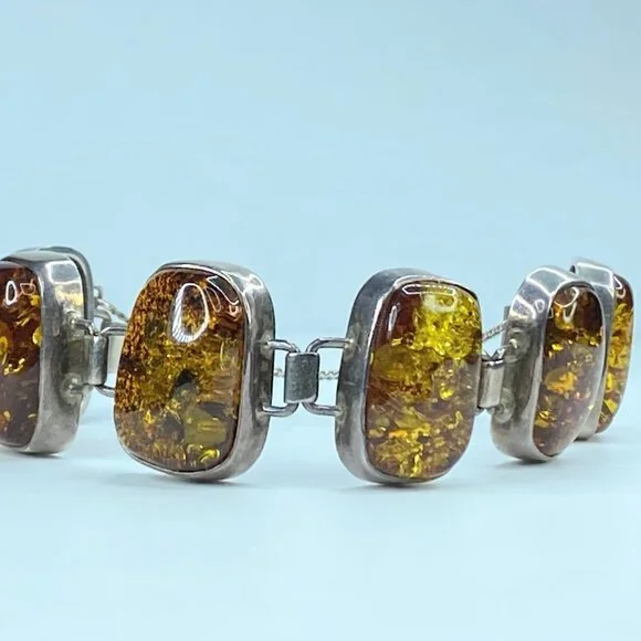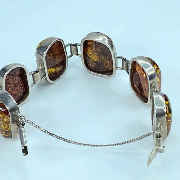Chunky Mid-Century Sterling Silver Open Back Natural Amber Bracelet. The natural formation of the crystal with decayed insects conveys a rectangular shape in a sterling bezel. Unique link: The amber is 23.0 x 16.0mm, and the tab box inserts clasp—safety chain. 7.75" weight 40.2 grams.