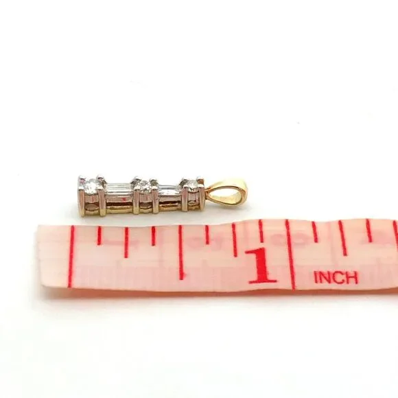 * 14K Yellow Gold Designer WGD Diamond Infinity Eternity Anniversary Bar Pendant* Length including bale: 13/16"* Inner bale measures: 3.5 mm x 2.5 mm * Width: 1/8"* Weight: 0.9 tgw* 3 Round Diamonds measures approximately 2.5 mm to 2 mm * 2 Baguette Diamonds measure approximately 2.5 mm x 1.6 mm to 3.2 mm x 1.6 mm * Chain is not included, but can be purchased for an additional price. * Marked: 14K * WGD * Condition: As pictured. * G4587