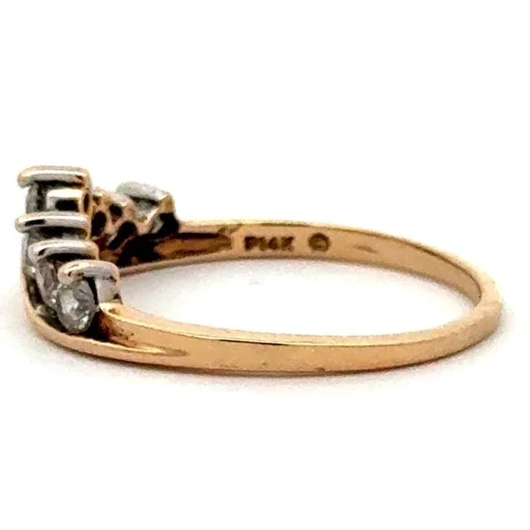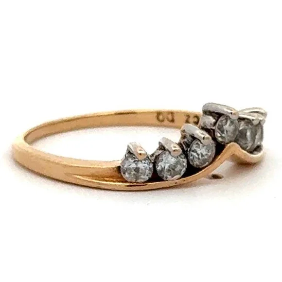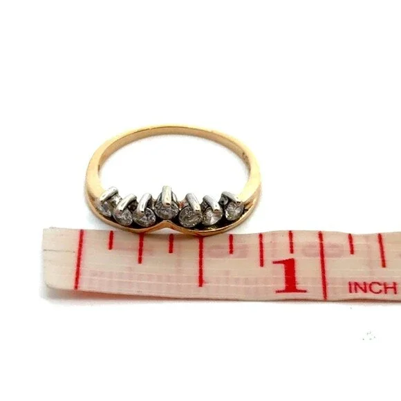 * Diamonique DQ 14k Yellow Gold White Cubic Zirconia CZ Wishbone Stackable Ring* Ring size: 6* Top of ring measures: 1/8" x 5/8" * Height: 1/8"* Band Width: 1.1 mm* 7 round cubic zirconias measure approximately 2.4 mm each * Ring weight: 1.8 tgw* Ring can be resized.* Marked: P14K * CZ * DQ* Condition: As pictured.* G5073
