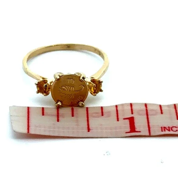 * Designer 14K Yellow Gold Yellow Diamond Zodiac Scorpio Birthday Scorpion Ring* Ring size: 6.5* Top of ring measure: 3/8" x 5/8"* Height: 1/4"* Band width: 1.5 mm* 2 round diamonds measure approximately 3 mm each* Weight: 1.8 tgw* Condition: As pictured.* G5075