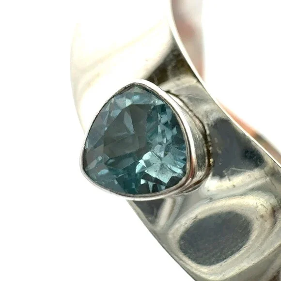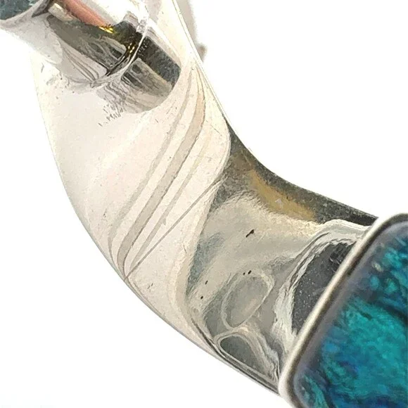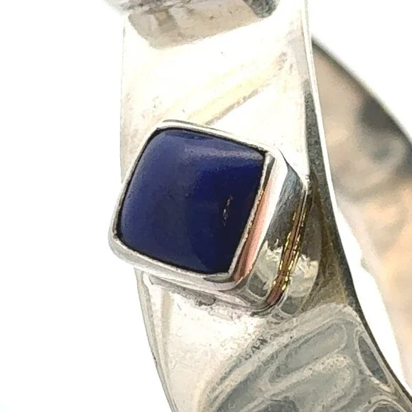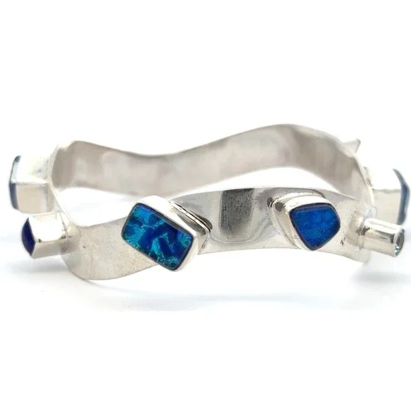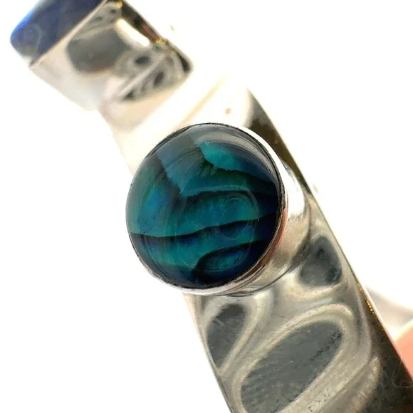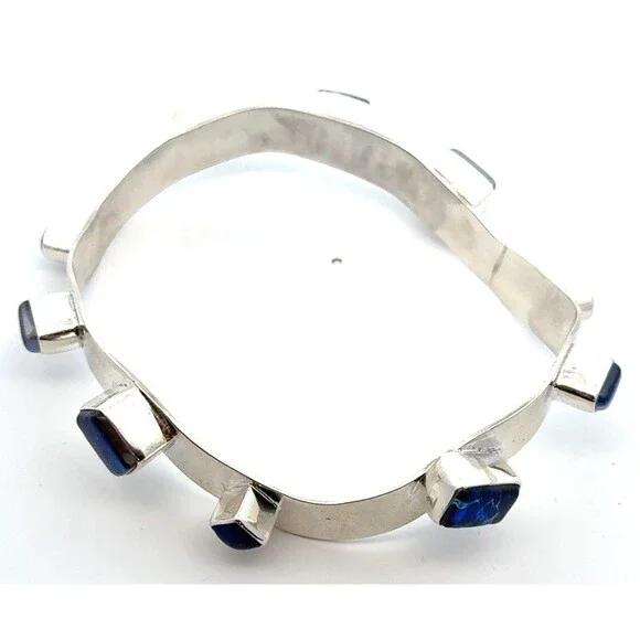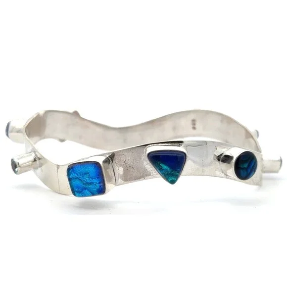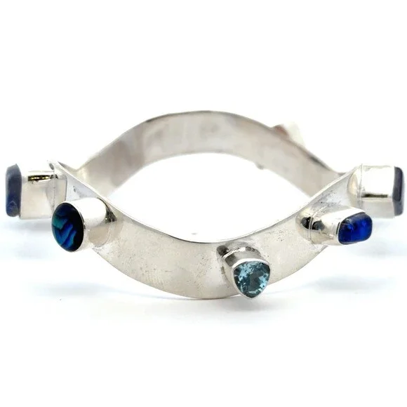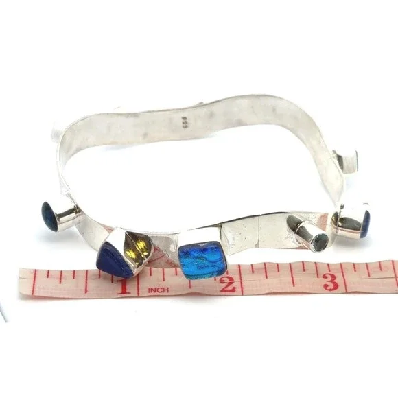 * Designer 925 Sterling Silver Multi Gemstone Modernist Bangle Bracelet* Length: 2-7/8"* Width: 3/8"* 6 dichroic glass stones measure approximately between 7 mm x 11 mm to 4.3 mm x 8.1 mm* 1 triangle topaz measure approximately 5.7 mm x 5.7 mm* 1 round topaz measure approximately 4.2 mm* 1 round abalone measure approximately 7.8 mm* 1 square lapis lazuli measures approximately 6.6 mm x 6.6 mm* Weight: 37.7 tgw* Marked: 925* Condition: As pictured.* S7351