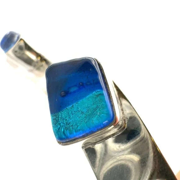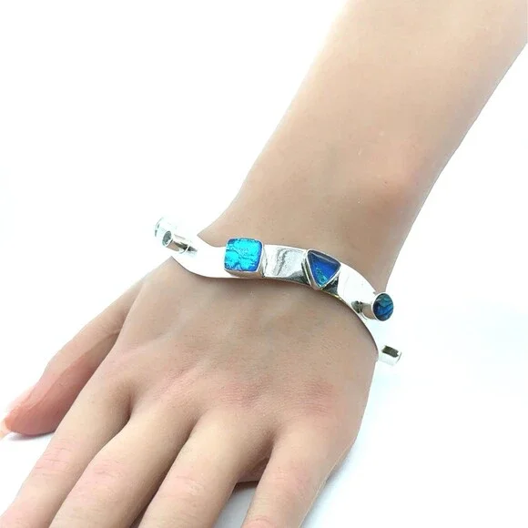 * Designer 925 Sterling Silver Multi Gemstone Modernist Bangle Bracelet* Length: 2-7/8"* Width: 3/8"* 6 dichroic glass stones measure approximately between 7 mm x 11 mm to 4.3 mm...
