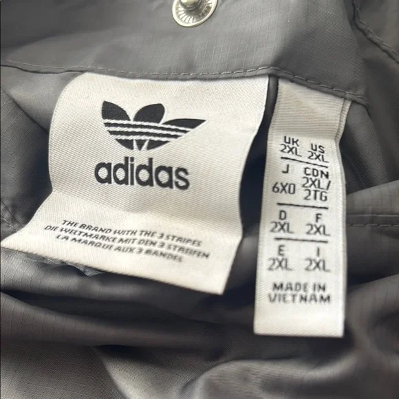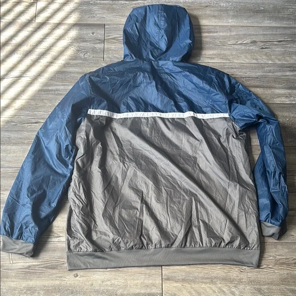 This Adidas windbreaker combines a stylish two-tone blue and gray design with practical features like a hood and full-length zipper. Made from lightweight, water-resistant...
