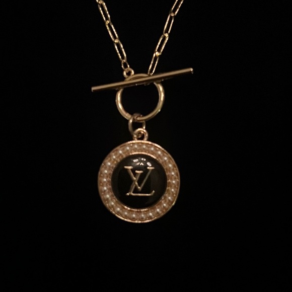 Louis Vuitton Charm Beautiful Black Gold with pearls LV Necklace PaperClip Round Toggle18K gold plated 18”long chain