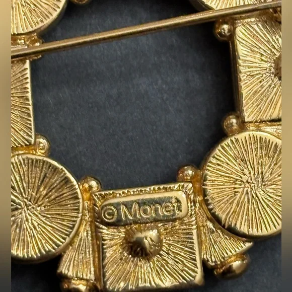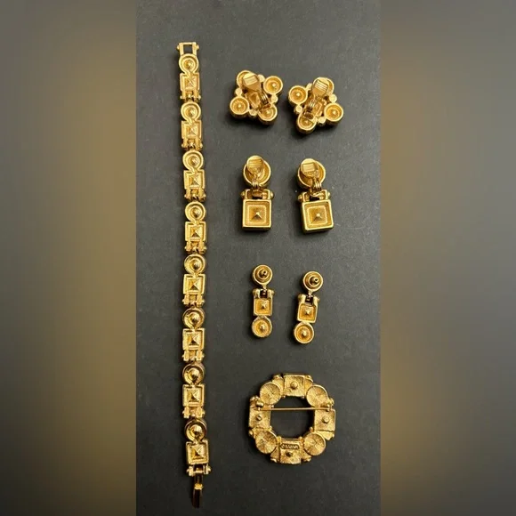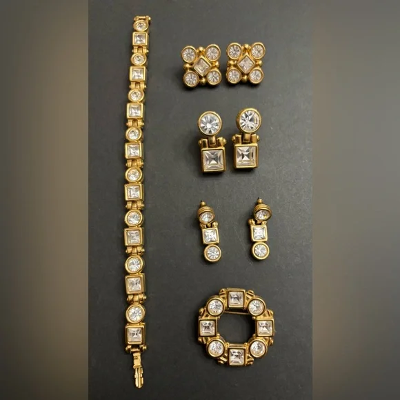 Vintage Monet Gold-Tone & Crystal SetOriginal owner. I was a Monet rep working behind the counter at a dept store in the 1990´s and fell in love with the brand.Set includes:1 necklace -approx 16.5"1 bracelet -approx 7.5"1 brooch-approx 1.5"1 set of pierced earrings- approx 1.25"1 set of clip drop earrings-approx 1.25"1 set of clip square earrings-approx 1"All items stamped "Monet"Pierced earrings are stamped on the backing. Minor scratches around clasp area.Overall very good condition. Probably worn 2-3x in the 90´s and has been in storage.All pieces could use a good polishing.Weight of entire set is 200gPlease message me for additional image requests.