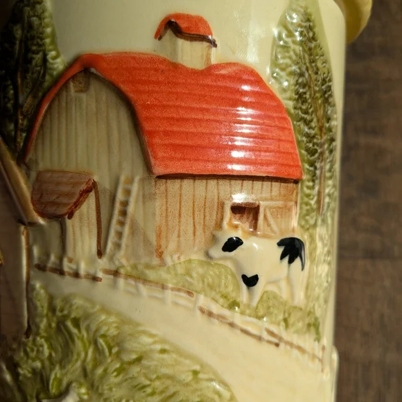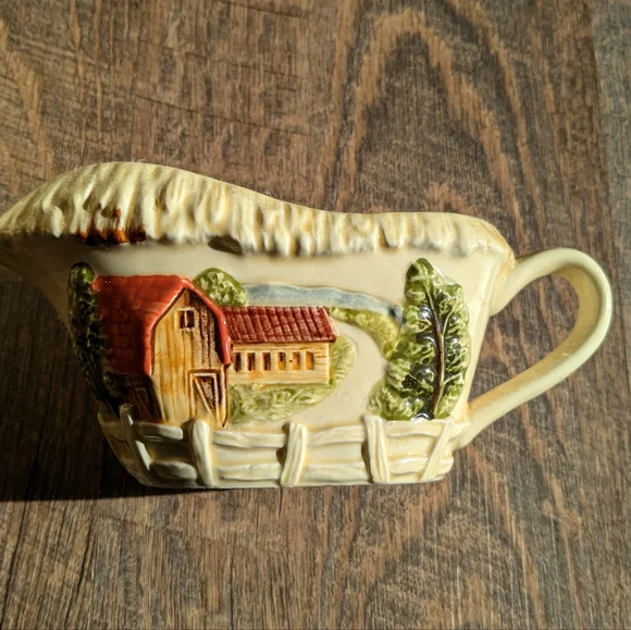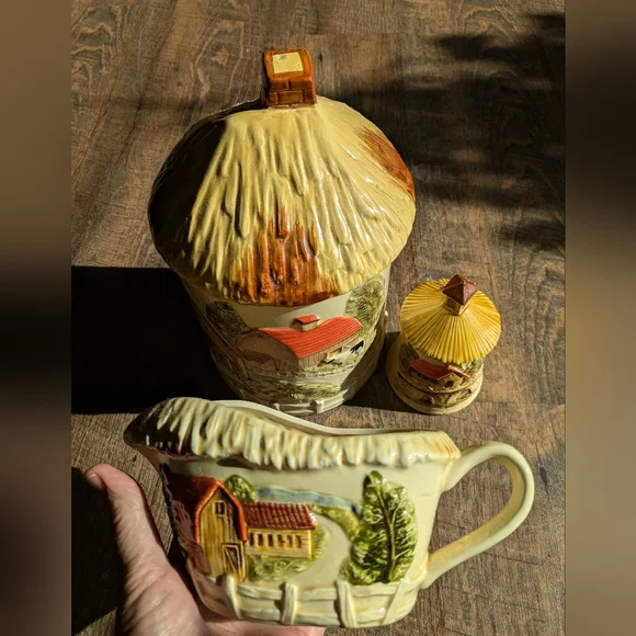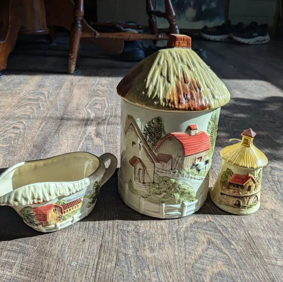 Marks Rosenfeld COOKIE JARFarmhouse cow Thatched Roof Country Barn Bell Gravy BoatLot of 3No chipsNo cracksCookie jar 10" Height x 7" Wide Country Barn Bell 5" Height x 3" Wide Country Gravy Boat 4" Height x 7.5" Wide