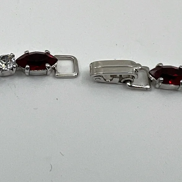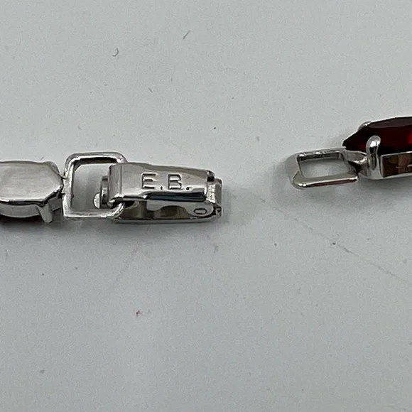 This is a lovely vintage necklace/choker by Engel Brothers circa 1930´3-1940´s. There aren´t a lot of their pieces on the market and though I have seen one similar necklace I have never seen this one in Ruby, diamond, pearl design. Engel Bros. jewelry was a partnership between Alfred and Frederick Engel founded in New York in 1930. The jewelry is high quality work - much of it in Art Deco style and could remind one of the work of Diamonbar. Their jewelry will be marked EB within a diamond shaped cartouche which was trademarked in 1943. This was my grandmothers, it is in pristine condition, marked EB on fold over clasp. It is a bright silver finish, though unmarked I assume it is rhodium plated silver. All prong set stones are paste ( faux) and I assume all the graduating sized tear shaped Tahitian pearls are faux. It is a lovely piece, my measurements are approximate.. 15" tip to tip and the the largest pearl hangs 1/2".