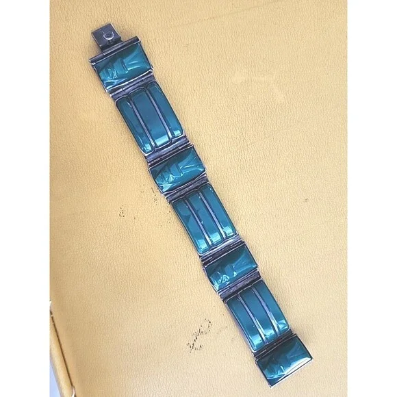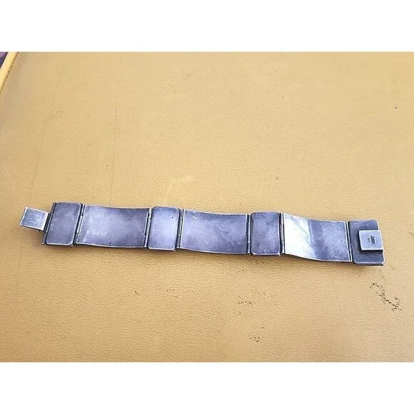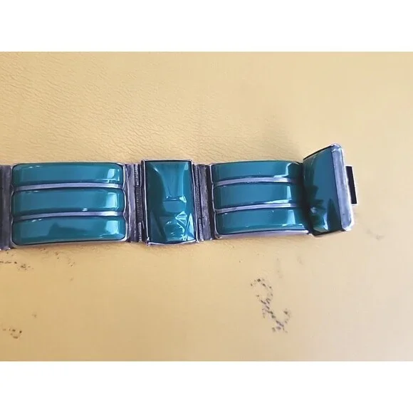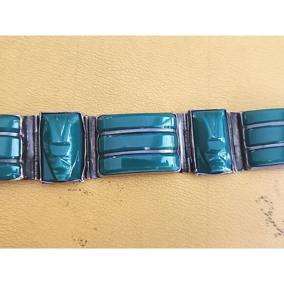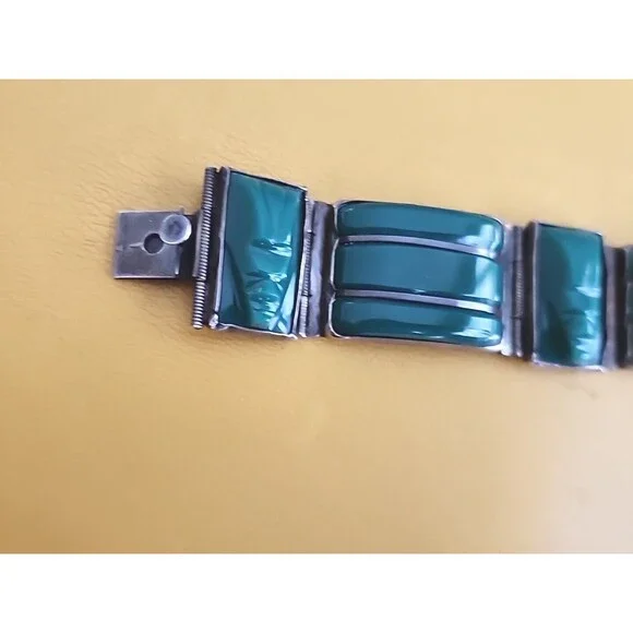 This unique handmade bracelet features a beautiful green agate cabochon set in sterling silver with an Aztec style design. The piece showcases intricate details of a Mayan warrior face and is signed by the artist. The bracelet has a slide closure and measures 7.6 inches in length.Perfect for any occasion, this vintage Taxco piece is a great addition to any jewelry collection. Celebrate milestones such as engagements, weddings, graduations, Christmas, anniversaries, birthdays, or Valentine´s Day with this one-of-a-kind bracelet. Made with high-quality materials, this bracelet is perfect for those who appreciate the beauty of antique jewelry.