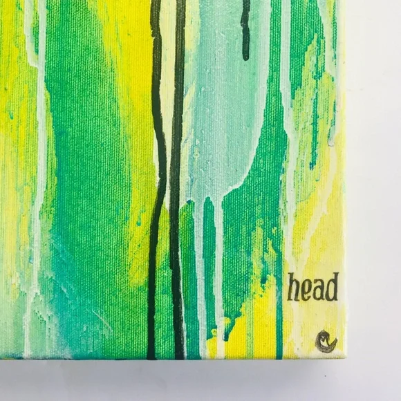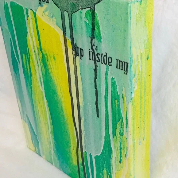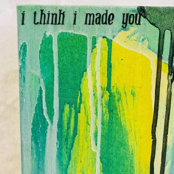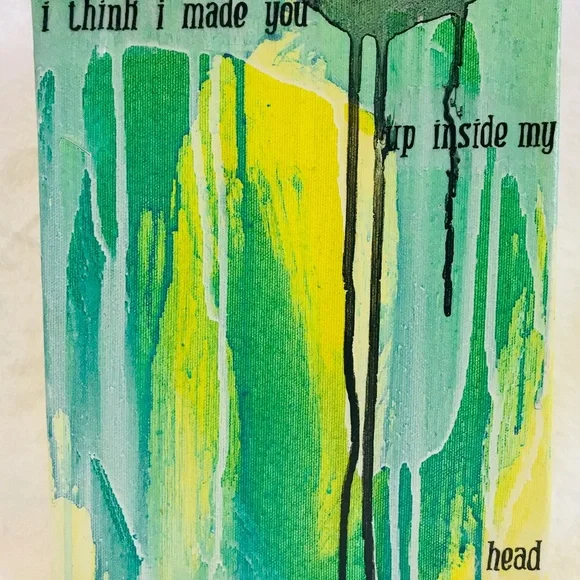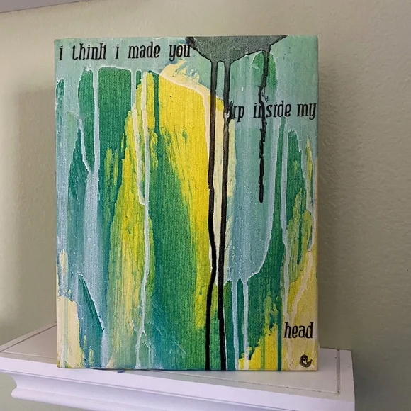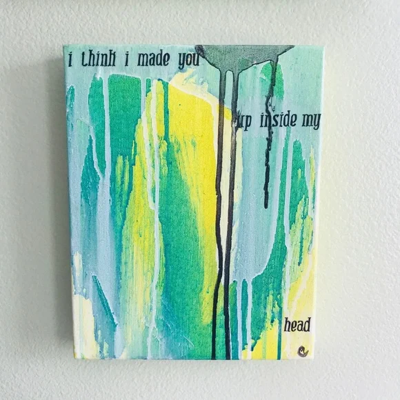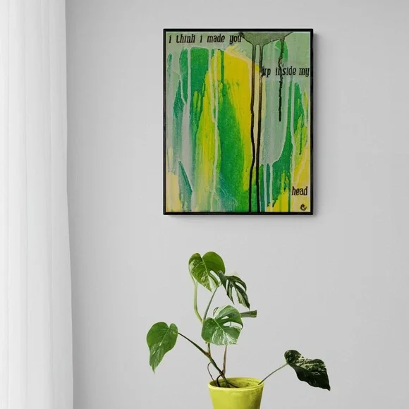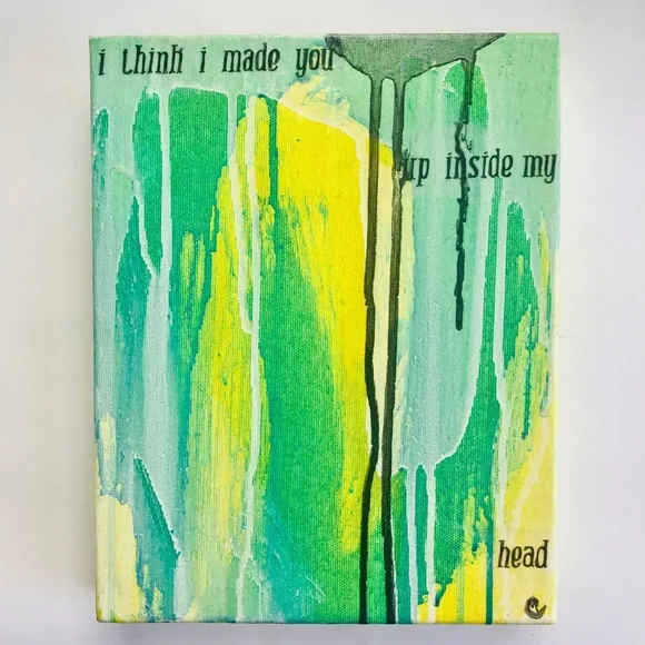 Green and Yellow Painting, Original Modern Abstract, Urban, Contemporary Colorful Collage Art, I Think I Made You Up Inside My Head, 8"X10"Brightly colored one of a kind abstract paintingAcrylic paint, collage, ink and gloss glaze on studio quality canvasColors include various shades of greens and yellows, white and black. Handwritten black ink text "I think I made you up inside my head" on clear tracing paper. Finished with a gloss varnish.Small black artist initial [MC] bottom right.Signed and dated on the back.8" x 10" x 1.5" stretched gallery quality canvas with deep painted sides.I received my Bachelors of Fine Arts, with a concentration in painting from the San Francisco Art Institute in 2006.*Painting does not come framed and is not to scale in first photograph