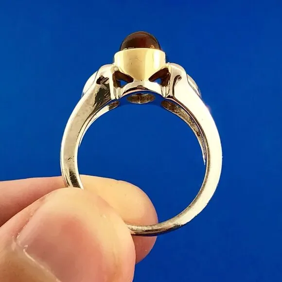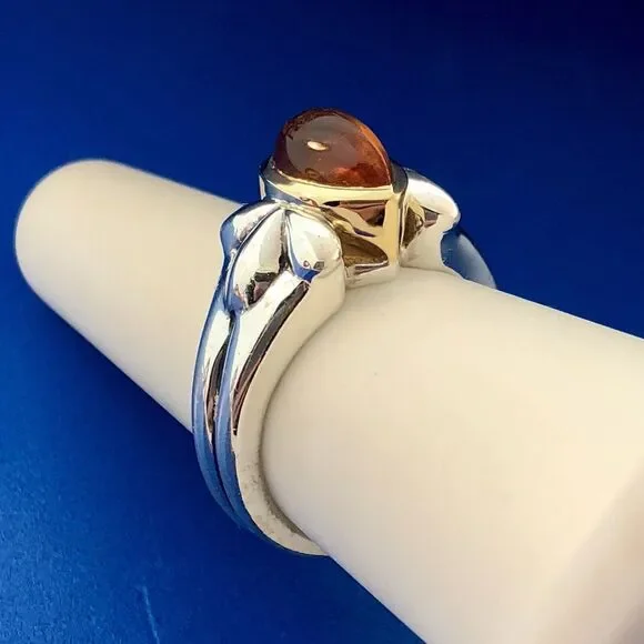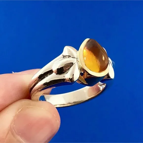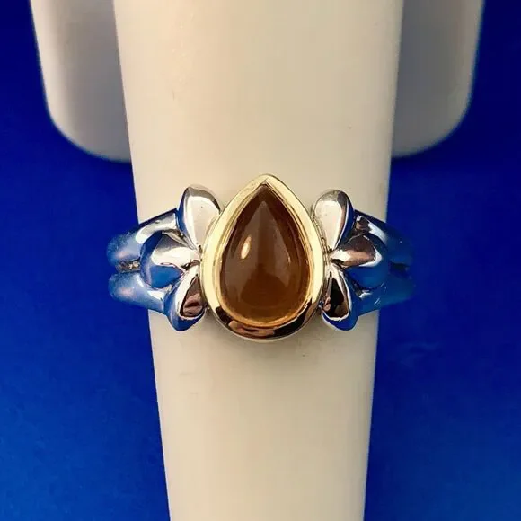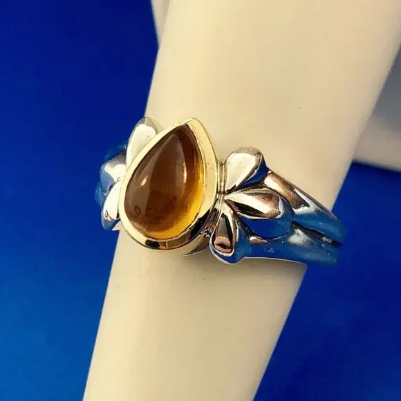 Designer Signed 925 Sterling Silver 18K Yellow Gold Citrine Pear Cabochon Ring