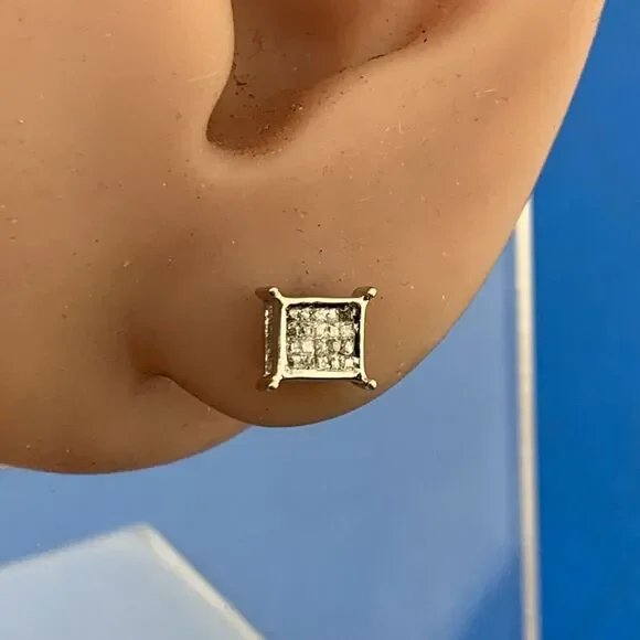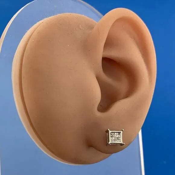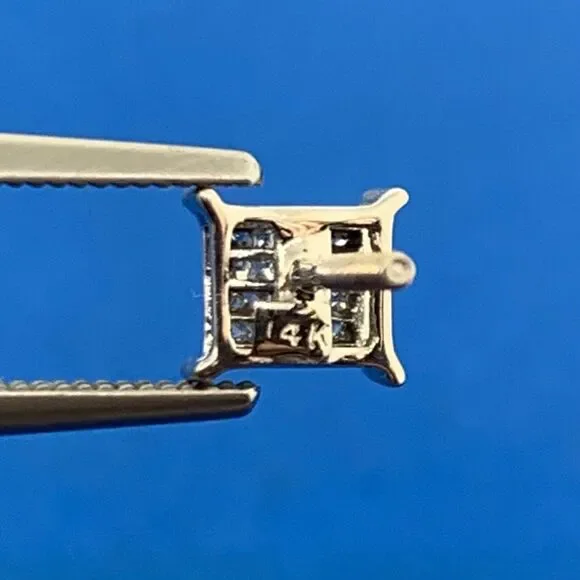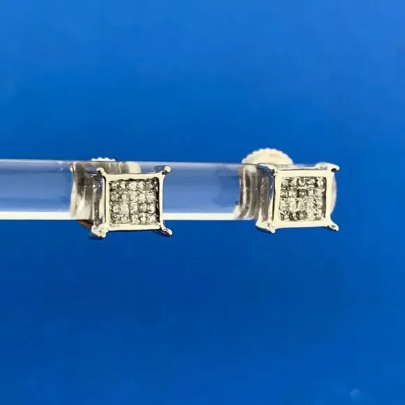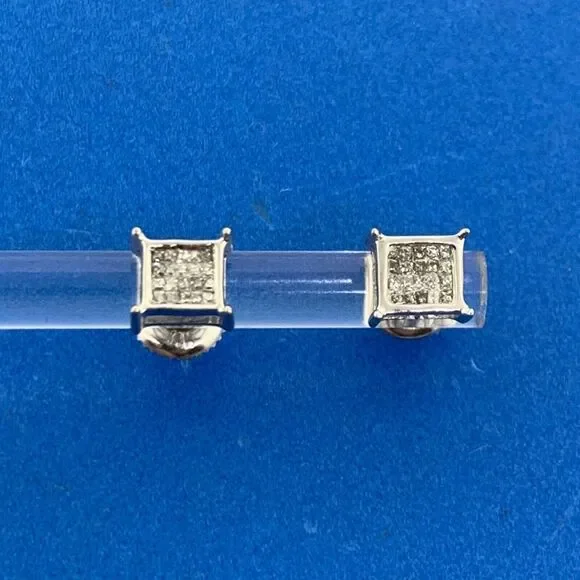 * 14K White Gold Pave Princess Diamond Screw Back Stud Earrings* Length: 1/4"* Width: 3/16"* Forty Princess Diamonds measure approximately .60 mm each* Weight: 1.4 tgw* Marked: 14K* Fastening: Screw Back-INCLUDED* Condition: As pictured.* G3201