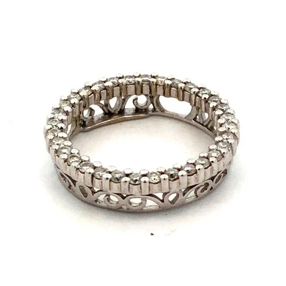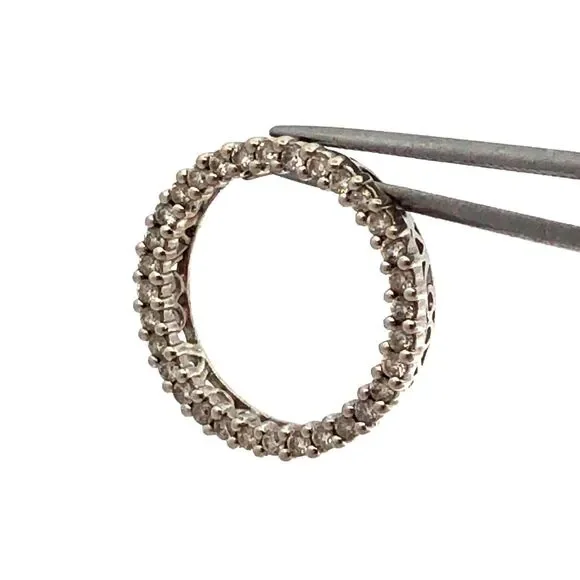 * Designer JX 14K White Gold Round Diamond Eternity Anniversary Pendant* Length: 3/4"* Width: 3/4"* Inner bale measures: 4 mm x 2 mm * Weight: 2.1 tgw* 33 Round Diamonds measure approximately 1.5 mm each * Chain is sold separately. * Marked: 14K * JX * Condition: As pictured. * G4910