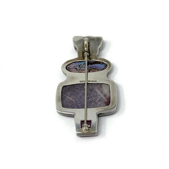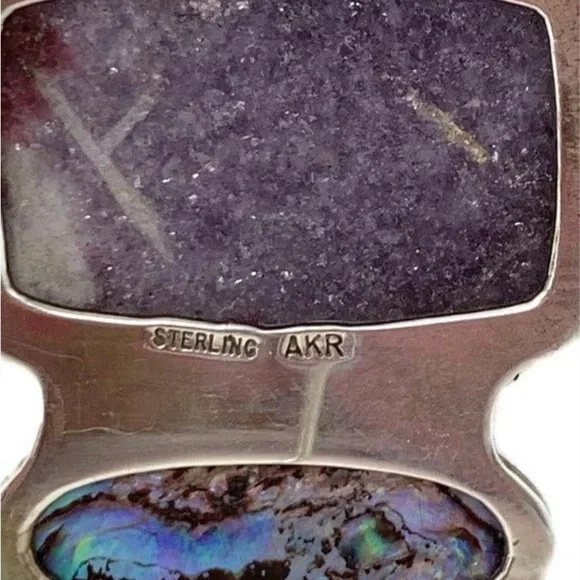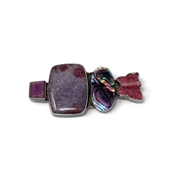 Offered for sale is a stunning vintage pendant from designer Amy Kahn Russell, perhaps OOAK?This statement pendant is in purple hues. It is comprised of abalone, lepidolite and ruby gemstones. This versatile piece can also be worn as a brooch. Measurements:A smidge over 2 3/4”H and 1 1/3”WWeight:25.4gHallmarks:Sterling, AKRCondition:Very nice vintage condition with light patina. Please examine pics for details. Questions? Leave a comment below!