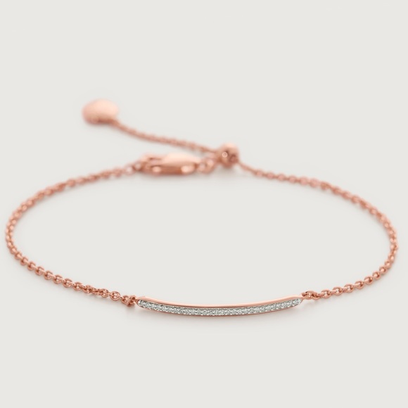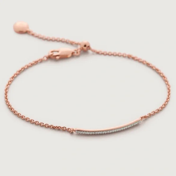 Used several times, keep perfect condition.•Skinny Short Bar Bracelet•18ct Rose Gold Vermeil & Diamond•Stone: Diamond•White Diamond 28 stones, 0.05 total cts•Bracelet circumference adjustable up to 18.5cm•Bar length 2.6cm, width 1.6mm•Chain width 1.4mm•Product code - RP-BL-PVSS-DIA