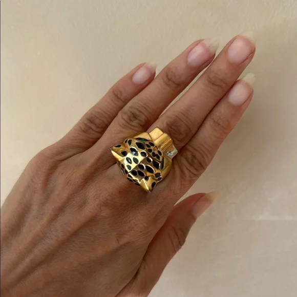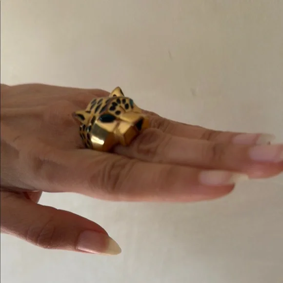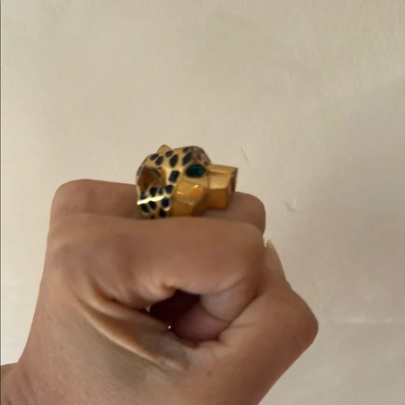 This striking gold and green ring features a bold animal head design, showcasing intricate sculptural details that catch the light beautifully. The luxurious gold tone and unique...