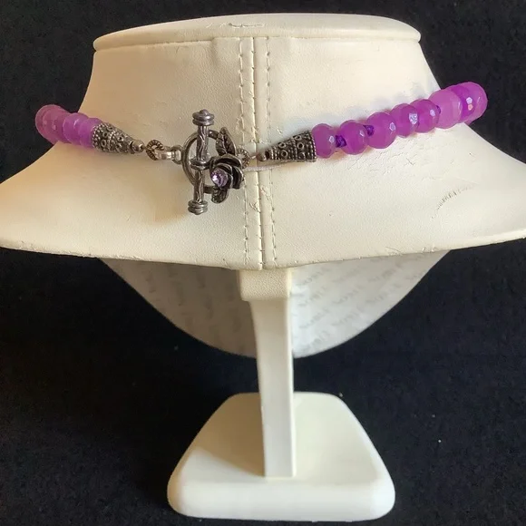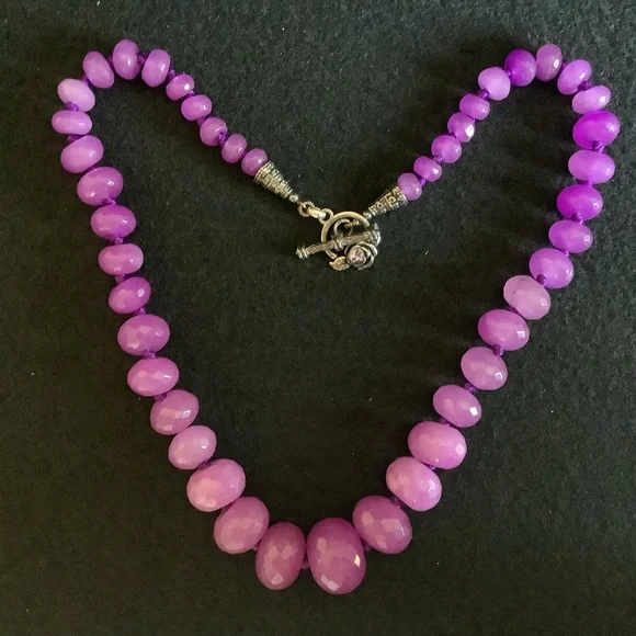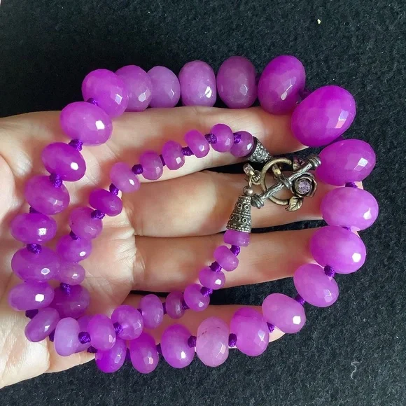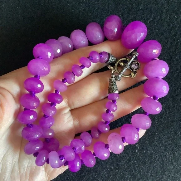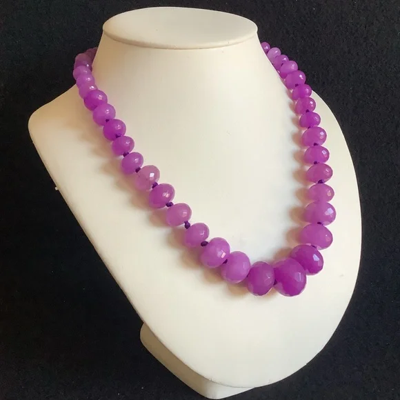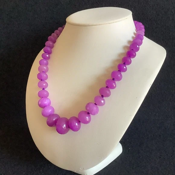 New Genuine faceted purple Quartz beads necklace.Excellent condition .Hand knotted. Silver tone clasp.Approx necklace length: 20” inches Approx beads size: 8mm to 20mmDisplay...