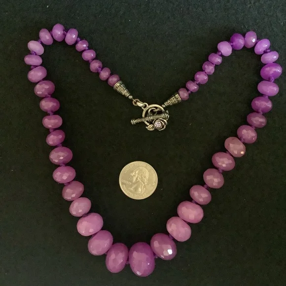 New Genuine faceted purple Quartz beads necklace.Excellent condition .Hand knotted. Silver tone clasp.Approx necklace length: 20” inches Approx beads size: 8mm to 20mmDisplay coin size 24mm#8-2