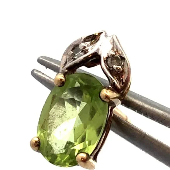 * Designer 10K Yellow Gold Green Peridot Diamond August Occasion Stud Earrings* Length: 7/16"* Width: 1/4"* Weight: 1.2 tgw* 2 Oval Peridot measures approximately 7.3 mm x 4.6 mm each* 4 Round Diamonds measure approximately 1 mm each * Closure: Butterfly * Backings are not included. * Marked: Makers Mark * 10K * G4612