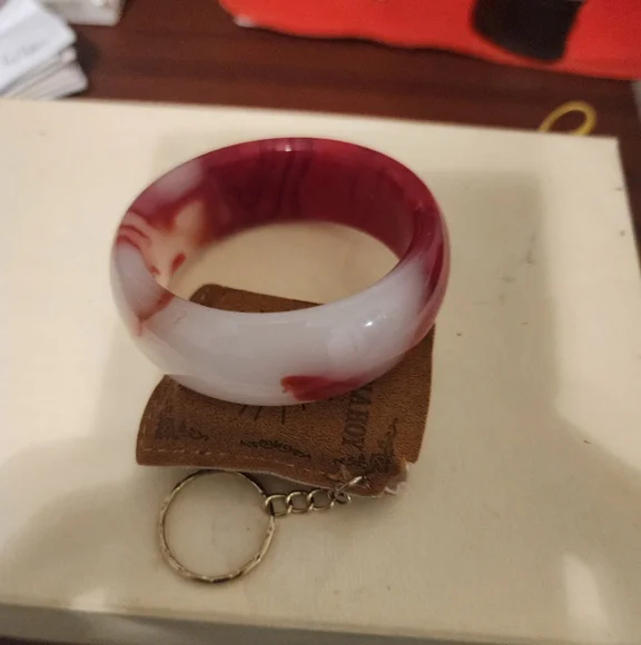 This stunning bangle bracelet features a beautiful blend of red and white colors, perfect for adding a touch of elegance to any outfit. it has a certificate, this is an Imperial Jade Bangle for a girl.