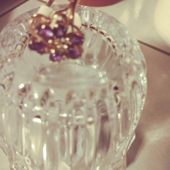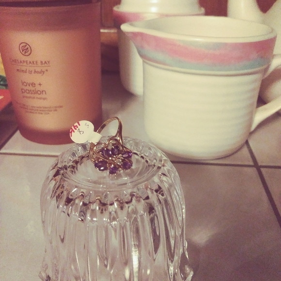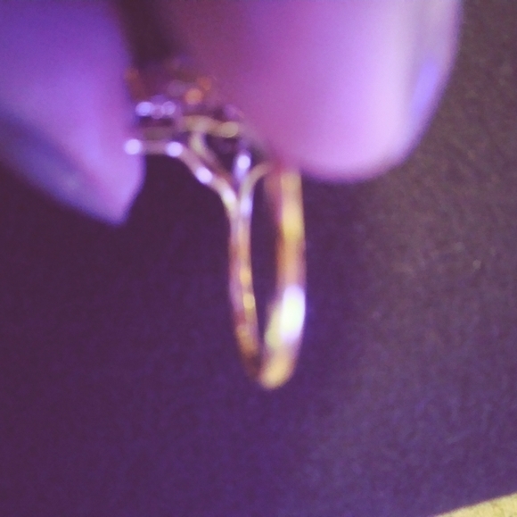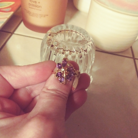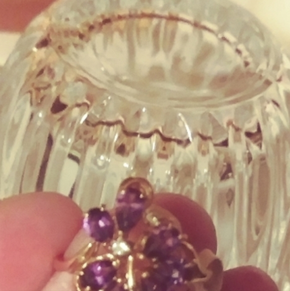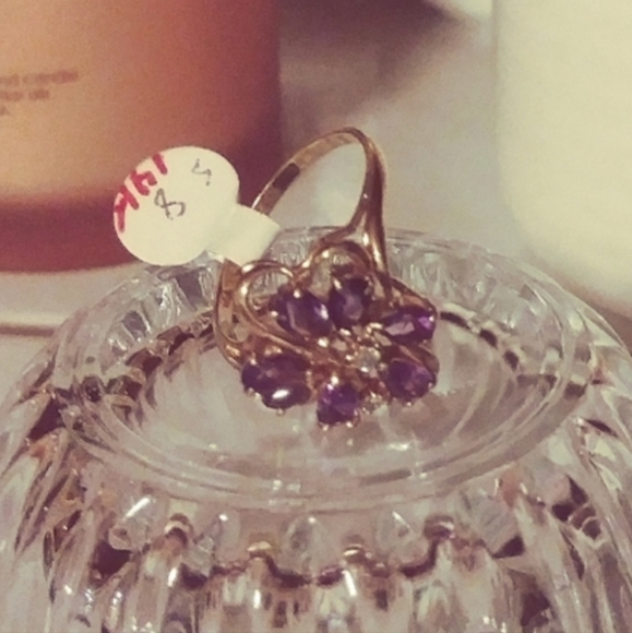 Beautiful Ring with real Amethysts and Diamonds in Solid 14 Karat Yellow Gold setting. Brand new, never worn. Hard to capture the beauty. Stamped 14k. Size 8.