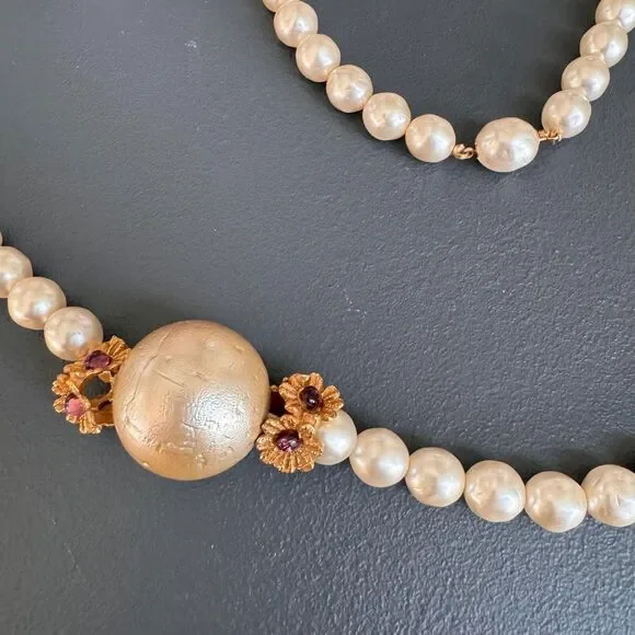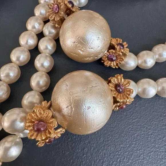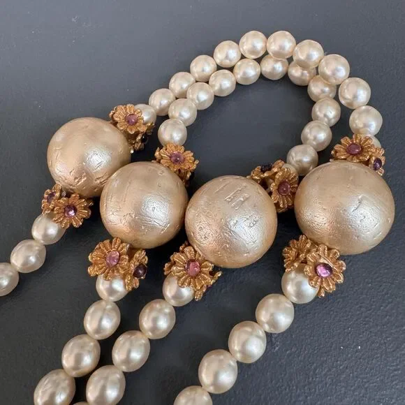 VERY PRETTY~ Vintage Art Deco era ~ Faux pearl beaded necklace with gold tone spacer beads with amethyst glass cabs in center of each flower ~ necklace ends with a hidden tongue...
