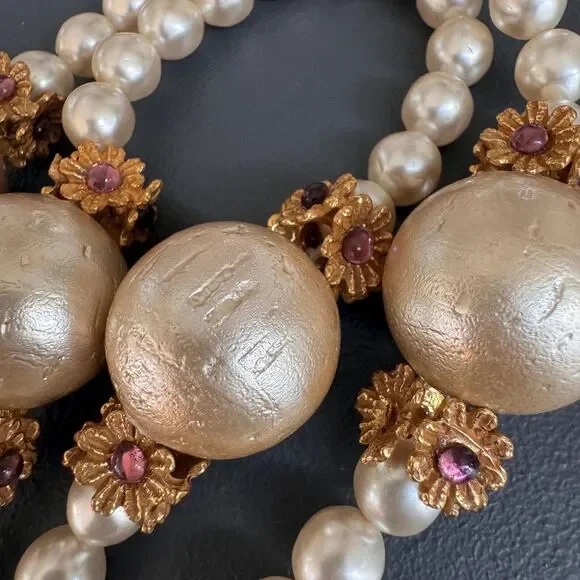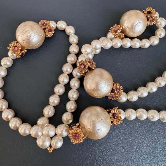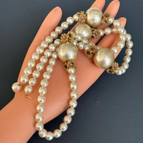 VERY PRETTY~ Vintage Art Deco era ~ Faux pearl beaded necklace with gold tone spacer beads with amethyst glass cabs in center of each flower ~ necklace ends with a hidden tongue and box clasp ~ This necklace is most likely made in FRANCE, though I am not 100% sure about it.UnsignedDates : first half of 20th century Measurements :Necklace measures 36 inches in length x 1 inches max width ~ Smaller pearl is average of 3/8 inches in diameter .Condition:Considering the age I will say the necklace is in Good vintage condition ~ If you move all beads to one end can see some remaining thread at the end (restring would definitely helped but can be enjoyed in as is condition ) ~ Clasp is in good working order ~ One of the small glass amethyst bead is missing .Please Note ~ As vintage items are previously loved /used please do expect some minor wear like surface wear /dents /dings and metal discoloration . All items are carefully inspected and major flaws will be listed separately ~ Plenty of photograph are added so please study the photos carefully as it is also part of description or if you need more pictures just message us we will be happy to provide them :)...Box is for display purpose does not included with the item .. but your items will be packed carefully and shipped promptly .Powered by ExportYourStore.com