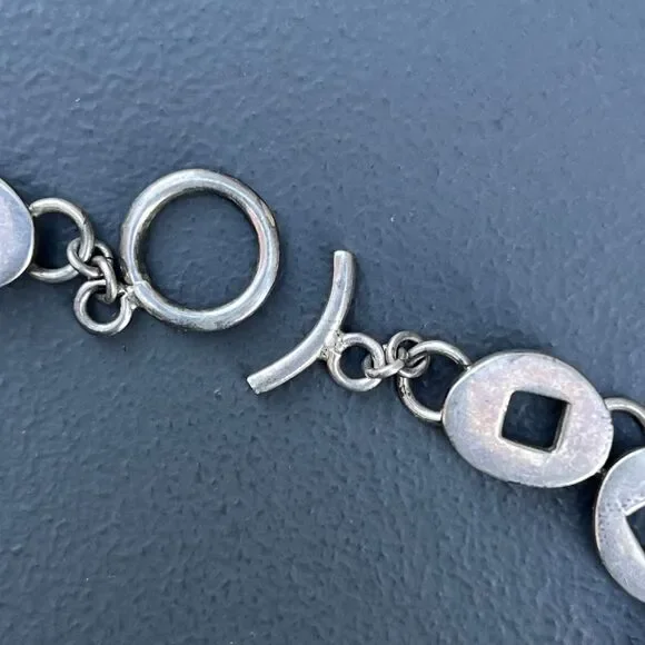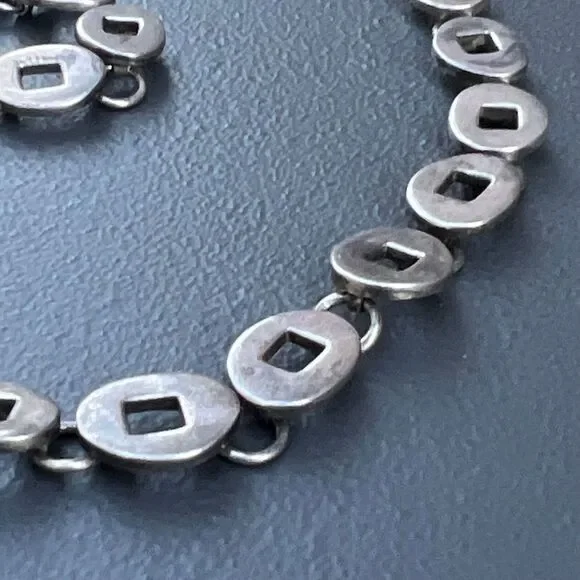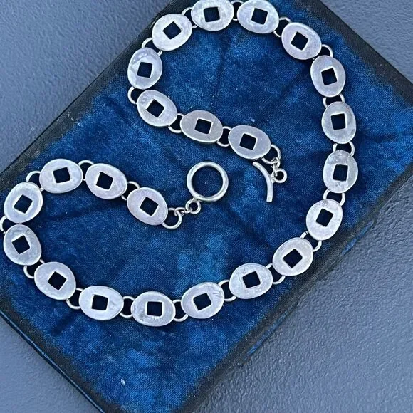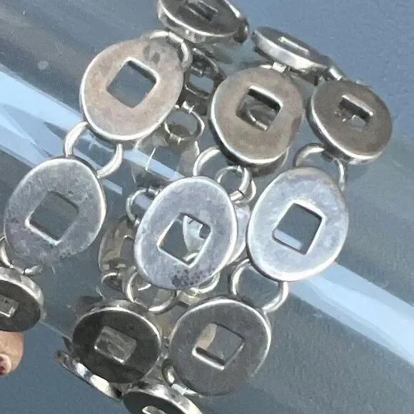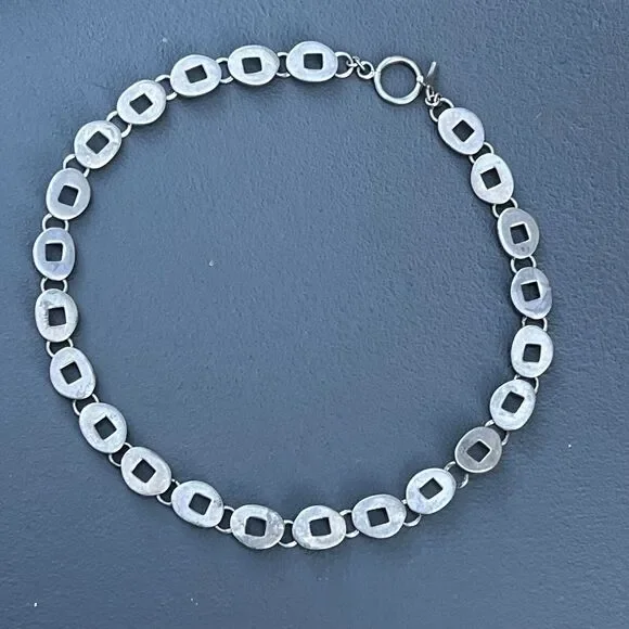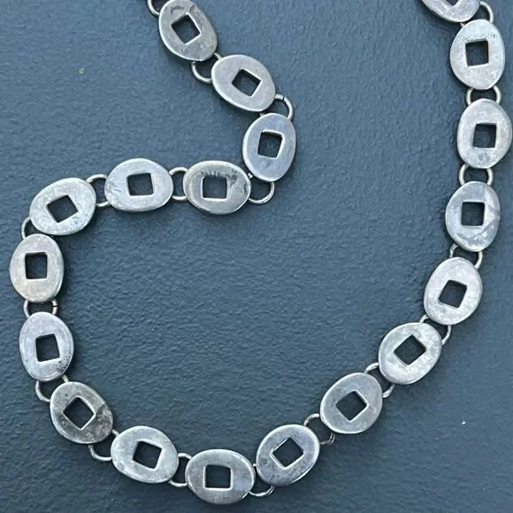 Wide Mod Modern Sterling Silver Oval articulated Link Chain Necklace with toggle clasp ~ Necklace has oval pierced solid sterling silver links .Dates late 20th century ~ Unmarked /unsigned but acid tests positive for sterling silver .Materials:Solid sterling silver Measurements :Necklace is 17 inches in total length x 3/8 inches max width.Weighs 63 grams on my weighing scale .Condition :Good vintage condition ~ Light Metal darkening /discoloration seen , comes with age and use ~ Clasp is in good working order ~ No repairs or damage to any of the links .Please Note ~ As vintage items are previously loved /used please do expect some minor wear like surface wear /dents /dings and metal discoloration . All items are carefully inspected and major flaws will be listed separately ~ Plenty of photograph are added so please study the photos carefully as it is also part of description or if you need more pictures just message us we will be happy to provide them :)...Box is for display purpose does not included with the item .. but your items will be packed carefully and shipped promptly .Powered by ExportYourStore.com