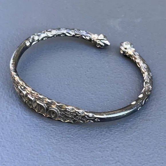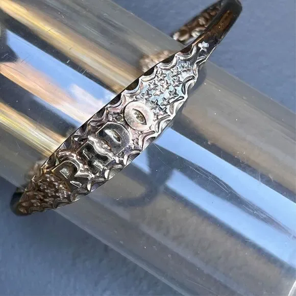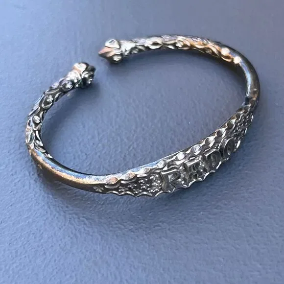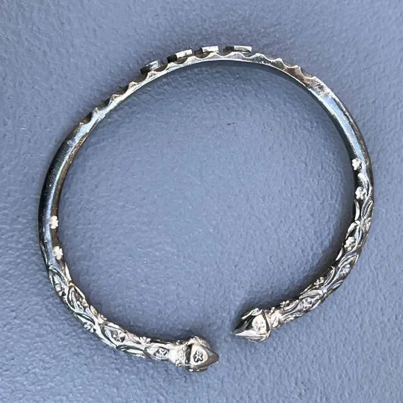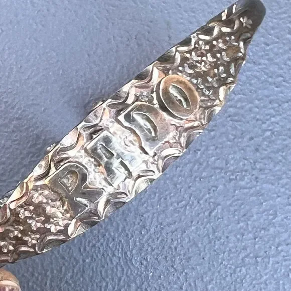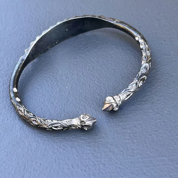 Vintage ~ Tribal ~ Solid silver ~ cuff bangle with Acorn heads ends and solid silver body with embossed/engraved floral scroll design near open ends ~ Center has written "RADO" on...