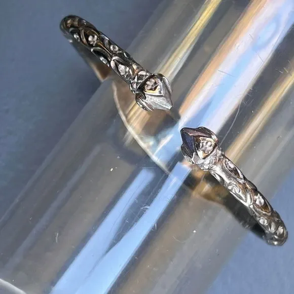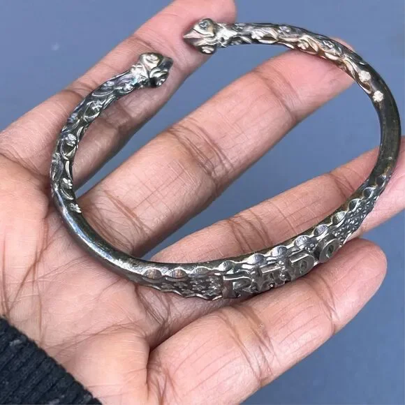 Vintage ~ Tribal ~ Solid silver ~ cuff bangle with Acorn heads ends and solid silver body with embossed/engraved floral scroll design near open ends ~ Center has written "RADO" on it. Bangles are handmade and is Unmarked silver (also acid tested for higher grade silver ) .Most likely these are handmade in India Measures :As the bangles are open at the ends it can be adjusted a bit according to your wrist /upper arm size ~ Approx. circumference / length of both the bangles is 7 1/8 inches x Max width is 1/2 inches .Weighs 39 grams on my weighing scale .Condition :Overall in good wearable condition with heavy age patina to silver ~ As the bangles are handmade they vary in design a bit but can be worn together.Please Note ~ As vintage items are previously loved /used please do expect some minor wear like surface wear /dents /dings and metal discoloration . All items are carefully inspected and major flaws will be listed separately ~ Plenty of photograph are added so please study the photos carefully as it is also part of description or if you need more pictures just message us we will be happy to provide them :)...Powered by ExportYourStore.com
