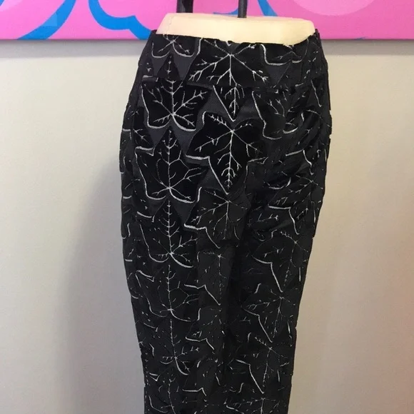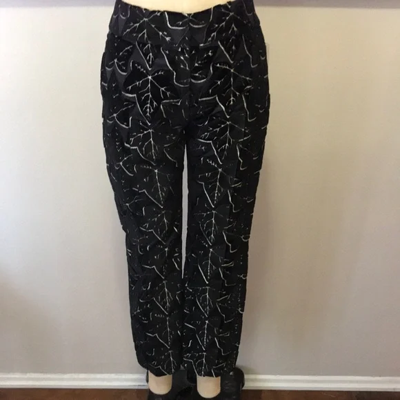 Runway pants by McQueen are perfect for special event dressing with shimmering thread that forms a leaf designCropped with flare so will look good with ankle boots Add a ruffle...