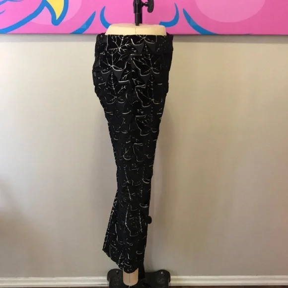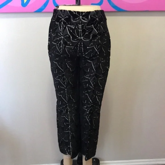 Runway pants by McQueen are perfect for special event dressing with shimmering thread that forms a leaf designCropped with flare so will look good with ankle boots Add a ruffle neck blouse and fitted vest for a finished look Made in ItalyNew With Tags Across Waist - 15 1/2 inAcross Hips - 19 in.Inseam - 24 1/2 in (cropped)Rise (low rise) - 9 1/2Silk/Acetate Blend - No stretch to this