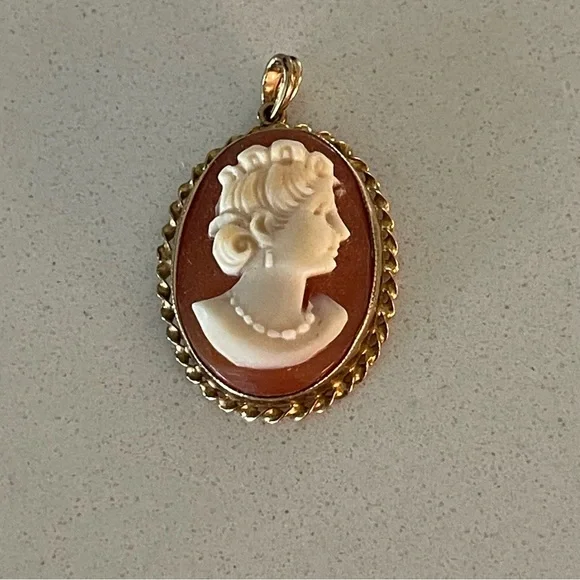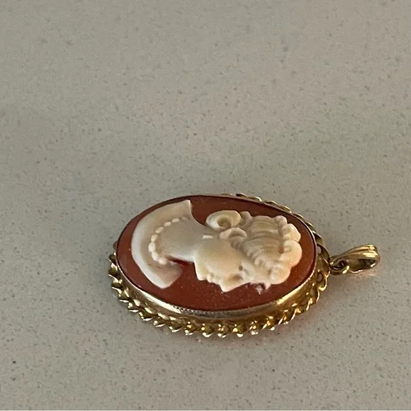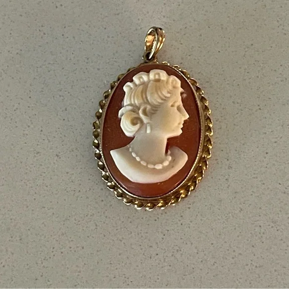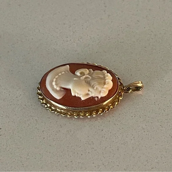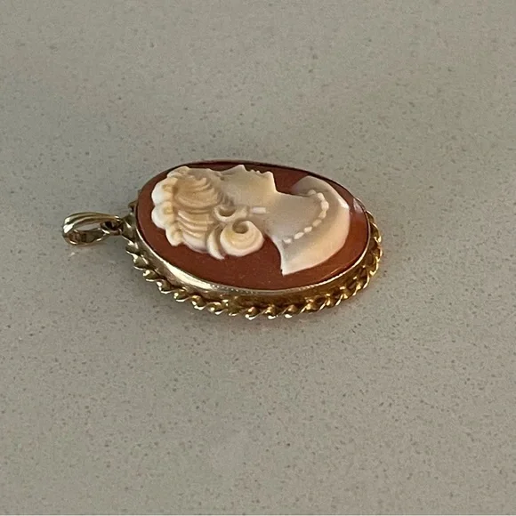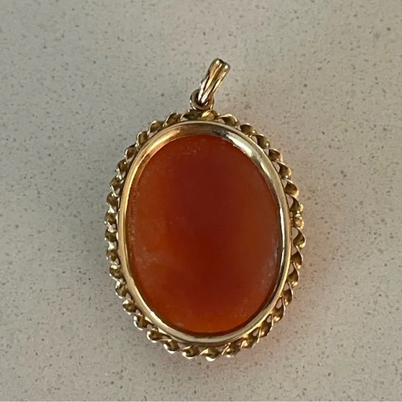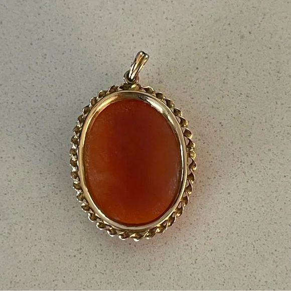 14kt. yellow gold frame cameo pendant, gold frame bezel with twisted edge, movable bale, 22mm long and 17mm wide, Cameos have historically symbolized power, wealth and status, particularly during the Roman Empire, great condition.