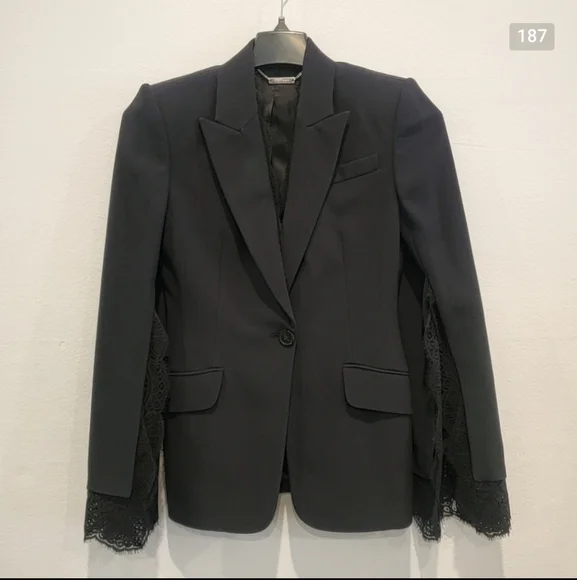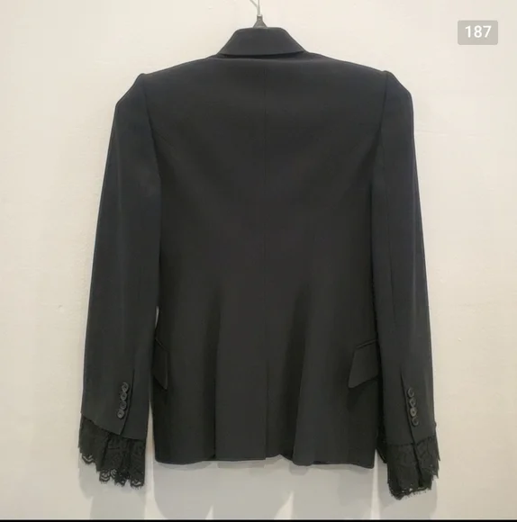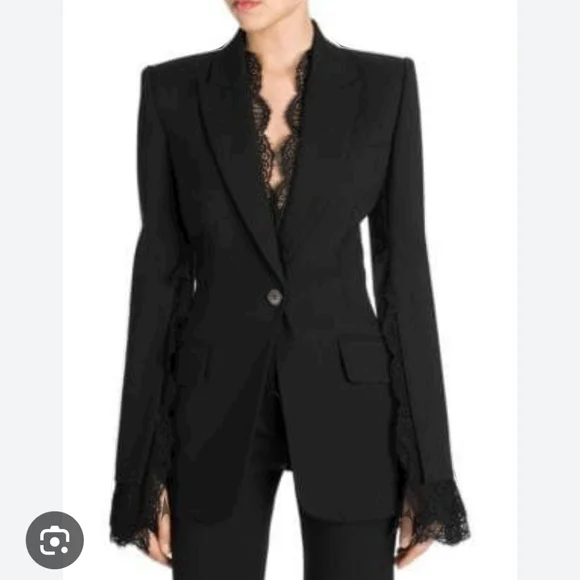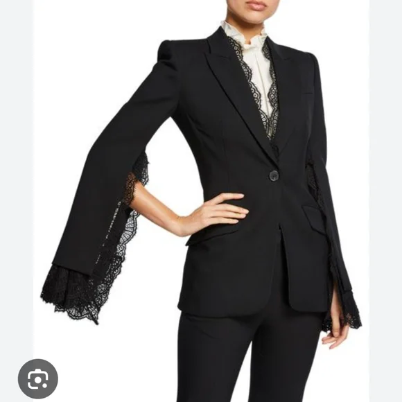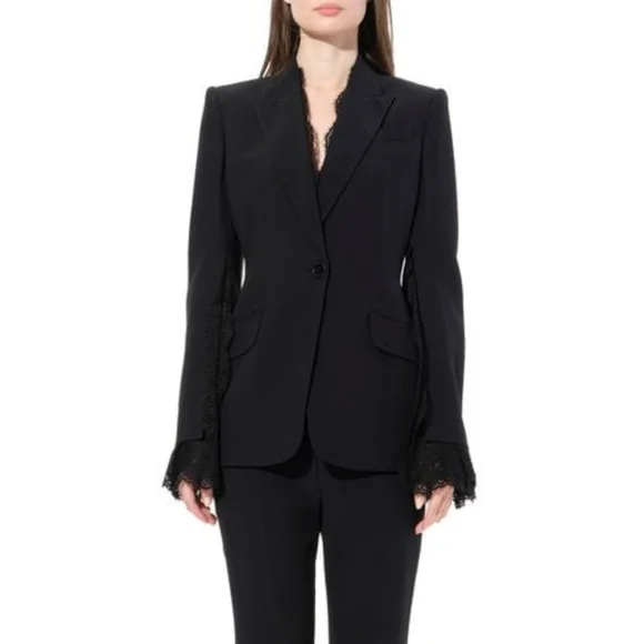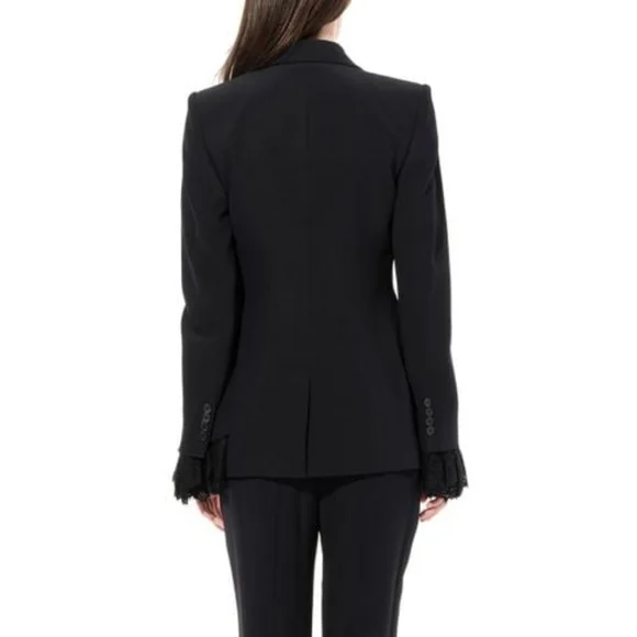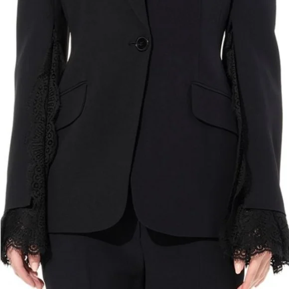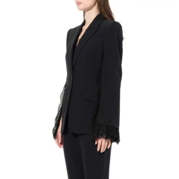 100% authentic. Blazer and matching pants. Excellent like-new condition! Black wool-blend crepe and lace Button fastening at front 63% wool, 25% silk, 12% polyamide Made in ItalyBlazer:Peaked lapelLong sleevesLace cuffsButton frontTwo front flap pocketsLace trimCupro linedViscose & acetateJust the blazer alone retails for $3,195!!
