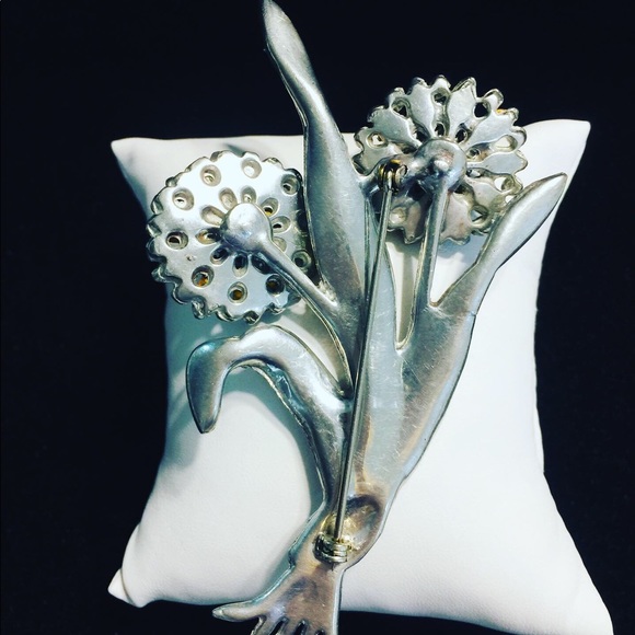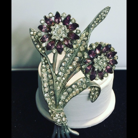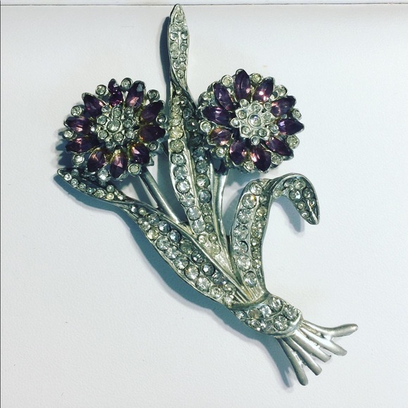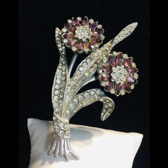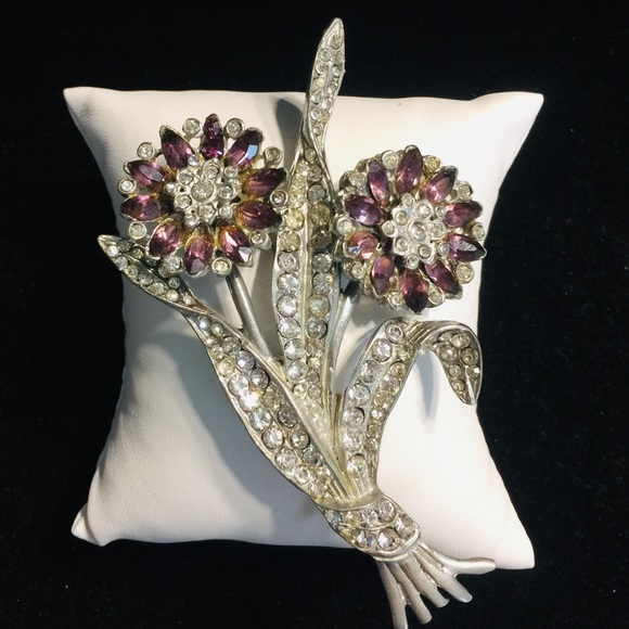 • Antique Large Crystal Paste Brooch• Gorgeous Floral Design• Purple and Clear Crystals• Heavy Silver Tone Double Flower • Dimensions: 3 1/2” H x 2” W