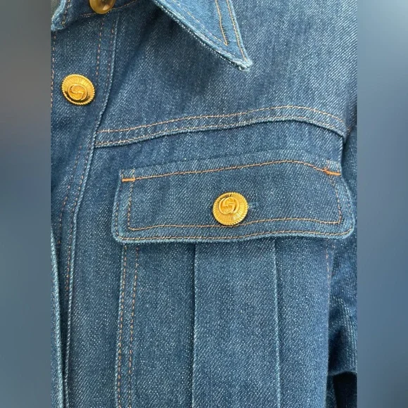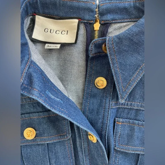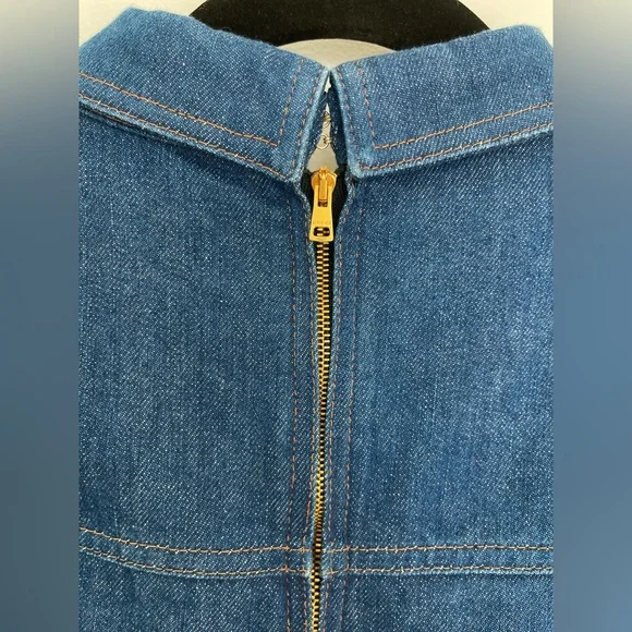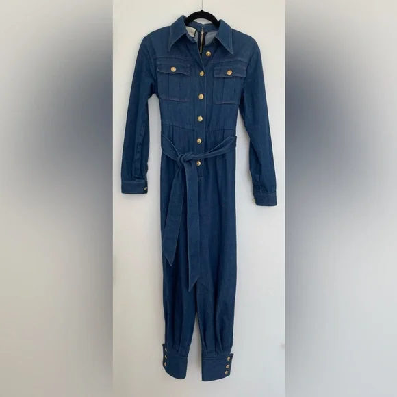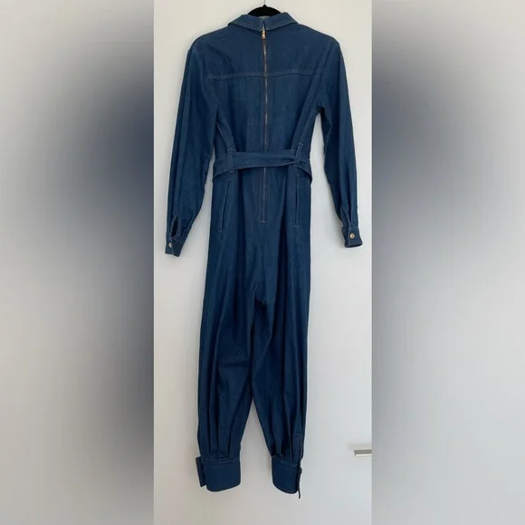 This long sleeve stretch denim jumpsuit in blue from has a spread collar, button closure at front, flap pockets at the chest, and a removable self-tie belt at the waist. The jumpsuit has a secure zip closure at the back and is adorned with gold-tone logo buttons. The denim fabric is 98% cotton and 2% elastane. Women´s size IT 38 or XS.