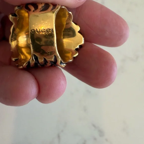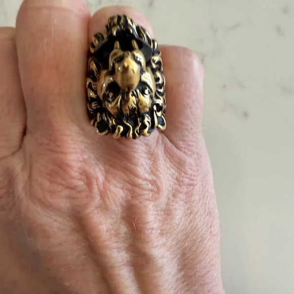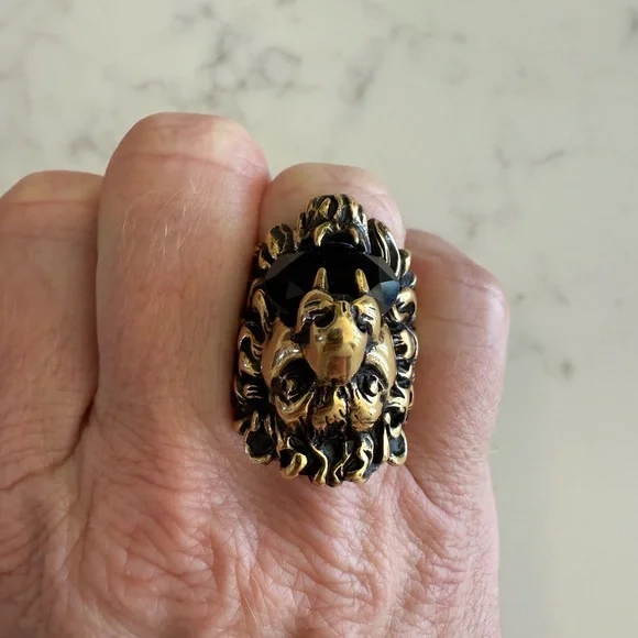 Lion Head Ring - Brass with black stone.Italian size 16 - An Italian size 16 ring has an inside diameter of 18.1 millimeters, which is equivalent to a US size 8. Very little wear and tear, no garish flaws.Great condition.Comes with bag and box.