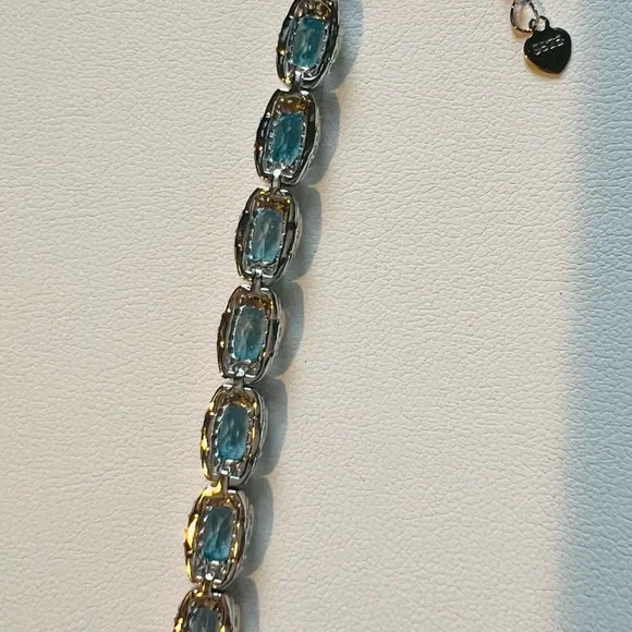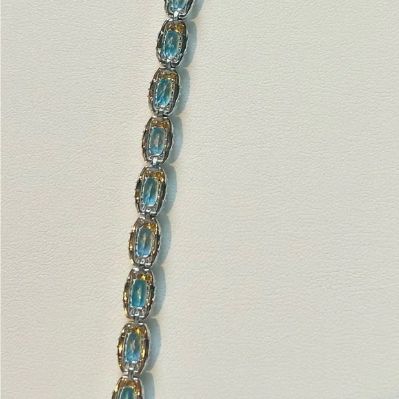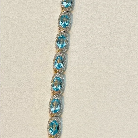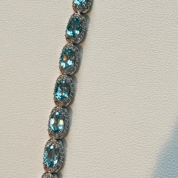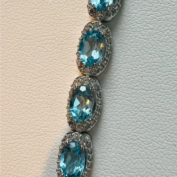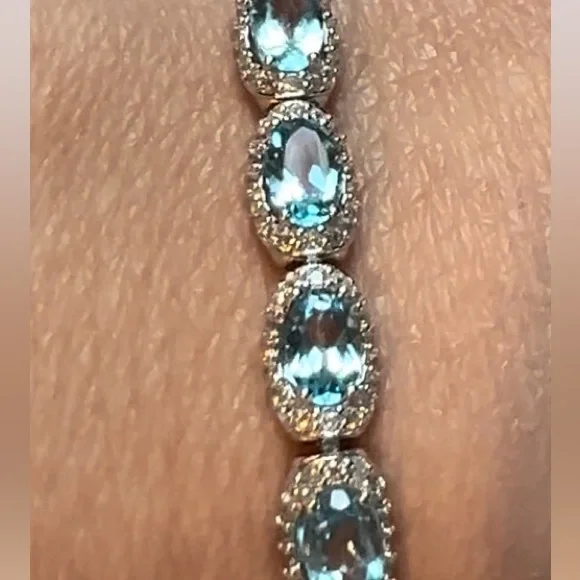 Item #BST2 ITEM DESCRIPTION:Main Precious Metal: Solid Sterling Silver Bracelet Top Precious Metal Plating: Rhodium plated, Rhodium is highly reflective and strongly resistant to corrosion, it is considered the rarest and most valuable precious metal in the world—far more so than gold or platinum!);Weight of Precious Metals: approx 9.3g;Stamp: S925Main Stone: Natural Swiss Blue Topaz—7ct;Main Stone Size: approx 6x4mm;Main Stone Cut: Oval cut—14 Stones;Main Stone Weight: TOTAL 7CT of TOPAZ: Natural Swiss Blue Topaz: 14 stones of 0.5ct each;Main Stone Country of Origin: Brazil;Side Stones: White Cubic Zirconia Bracelet Length: 5.8”—7.2”.Bracelet Type: Chain and Link;Bracelet Style: TENNIS Bracelet;Bracelet Clasp: Lobster Clasp;Swiss Blue TOPAZ is the stone of communication, truth, wisdom and manifestation! Topaz Month: December;Blue Topaz Zodiac Sign: Sagittarius and Capricorn;Blue Topaz Chakra: Throat Chakra and Third Eye Chakra!