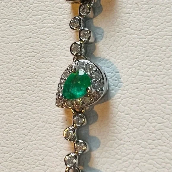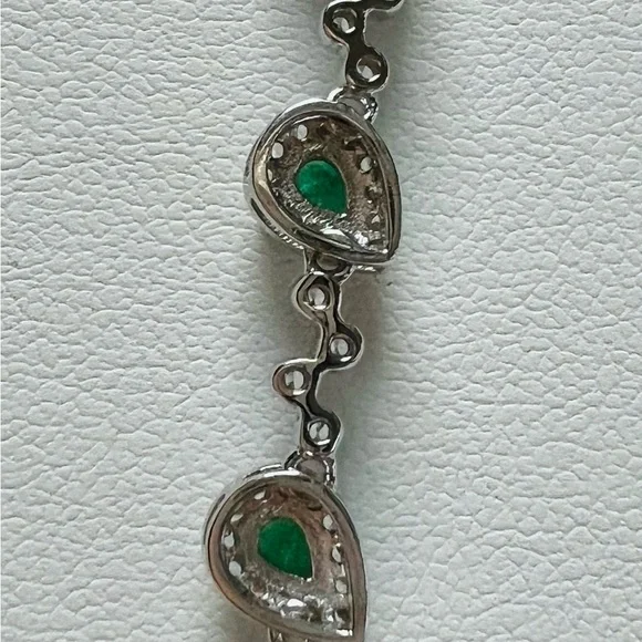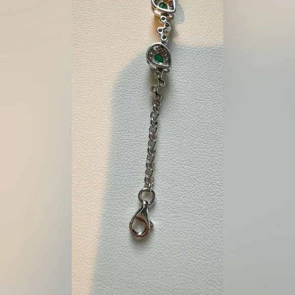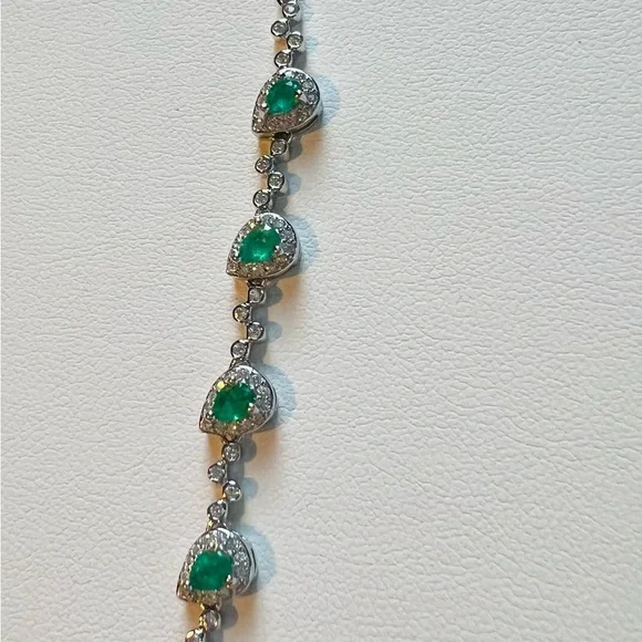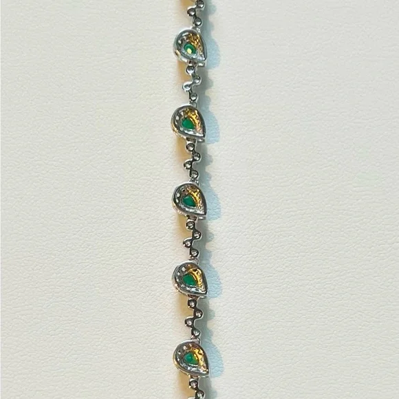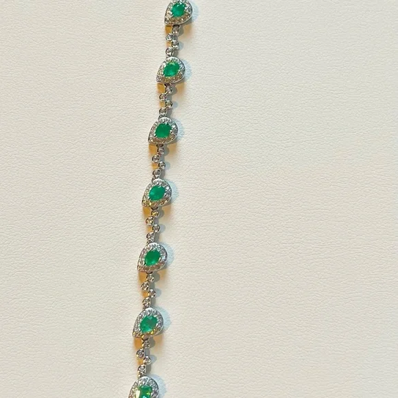 Item #BE1ITEM DESCRIPTION:Main Precious Metal: Solid Sterling Silver Bracelet Top Precious Metal Plating: Rhodium plated, Rhodium is highly reflective and strongly resistant to corrosion, it is considered the rarest and most valuable precious metal in the world—far more so than gold or platinum!);Weight of Precious Metals: approx 5.6g;Stamp: S925Main Stone: Natural Green Emerald—1.05Ct;Main Stone Size: approx 3x4mm;Main Stone Cut: Pear Shape/ Teardrop Cut;Main Stone Weight: TOTAL 1.05CT of Natural Kelly Green Emerald—7 stones of 0.15CT;Main Stone Country of Origin: Zimbabwe;Side Stones: White Cubic Zirconia Bracelet Length: 6”-7.4”;Bracelet Type: Contemporary Dainty;Bracelet Style: Unique Contemporary;Bracelet Clasp: Lobster Clasp;EMERALD symbolizes loyalty, new beginning, peace and serenity!EMERALD is the stone of inspiration and patience! Known as the “stone of successful love”, it brings bliss and loyalty!Emerald aids recovery after infectious illness. It treats sinuses, lungs, heart, spine, and muscles, and soothes the eyes! It improves vision and has a detoxifying effect on the liver! Emerald Month: May and August;Emerald Zodiac Sign: Taurus and Cancer;Emerald Chakra: Heart Chakra!