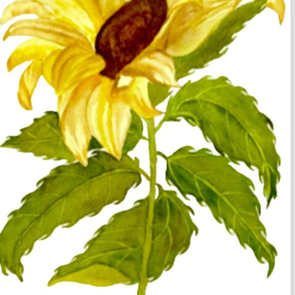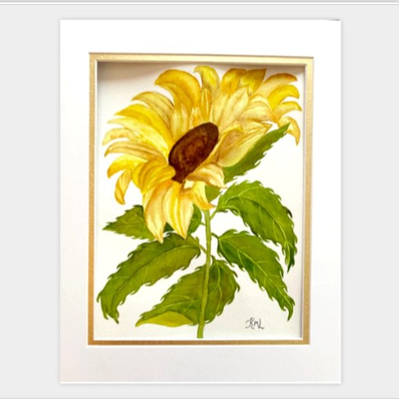 SUNFLOWERWITH GREEN LEAVESWATERCOLOR PAINTINGORIGINAL PAINTINGONE OF A KINDTHIS IS NOT A PRINTTHE WATERCOLOR PAINTING SIZE IS 8"X10 3/4"WITH 11"X14"DOUBLE WHITE OUTER MAT AND GOLD INNER MATMATBOARD IS INCLUDEDPainted on 140lb cold pressed watercolor paper with Windsor & Newton watercolor paintsSince the painting includes the mat, it is ready for you to put into a standard size 11"x14" frame.A frame is not includedTHE PAINTING IS SIGNED WITH INITIALS ON THE FRONT AND A FULL SIGNATURE ON THE BACK.The condition is new