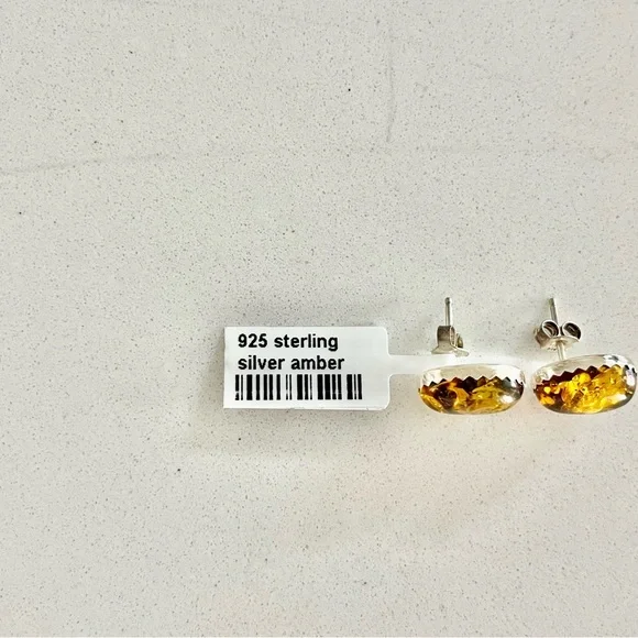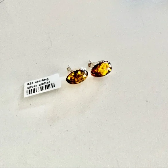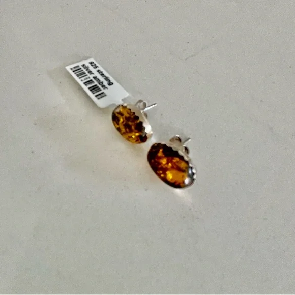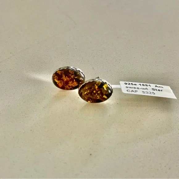 Sterling silver 925 Amber earrings, 14x10mm oval Cabachon stones, set in serrated bezels with posts and ear-nuts, new with tags.