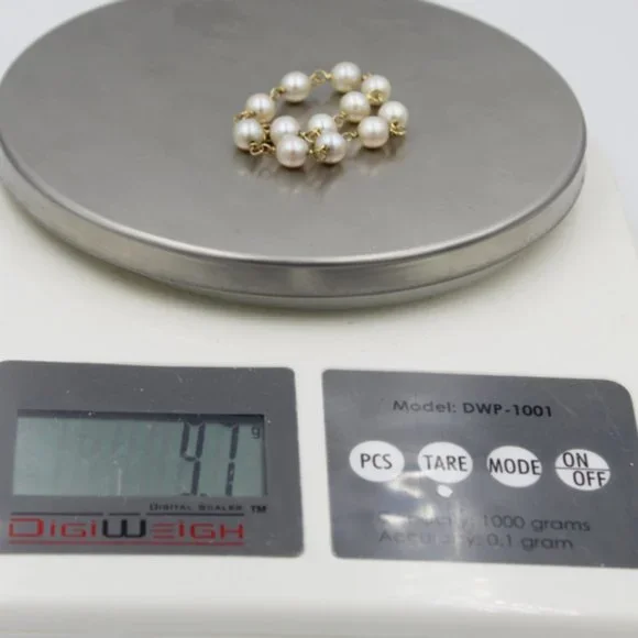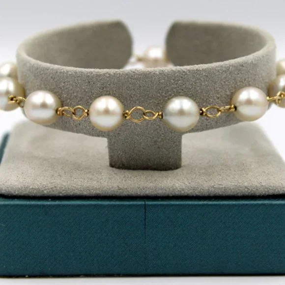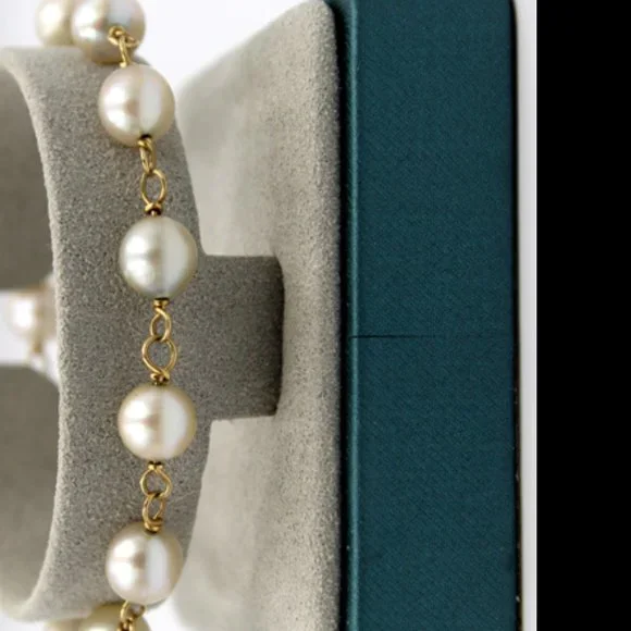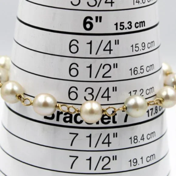 This NWT beautiful 14K yellow gold station bracelet is comprised of genuine cultured pearls with 14k yellow gold links between each pearl stone in the bracelet. It is a stunning piece of fine jewelry. The bracelet features twelve cultured pearls that are Ivory in color. Each pearl approximately measures 8.5 mm long X 7.5 mm wide X 7.4 mm in depth. Each cultured pearl is approximately 2.92 carats. The approximate total carat weight of the twelve pearls is 35.04 carats. The 14K yellow gold links are attached to each peal in the bracelet. Each link is approximately 4 mm wide.On the shown bracelet measurement tool, it is approximately 6 3/4 in length. When the bracelet is lying flat, it approximately measures 7.25 inches. The 14K yellow gold links and clasp tested 14K using a Presidium gold tester. The 14K yellow gold clasp is marked "14K."The gram weight of the bracelet is approximately 9.7 grams.This is a new, unworn item. This item is in excellent overall condition. Please refer to the pictures concerning the description and condition of this item.