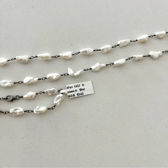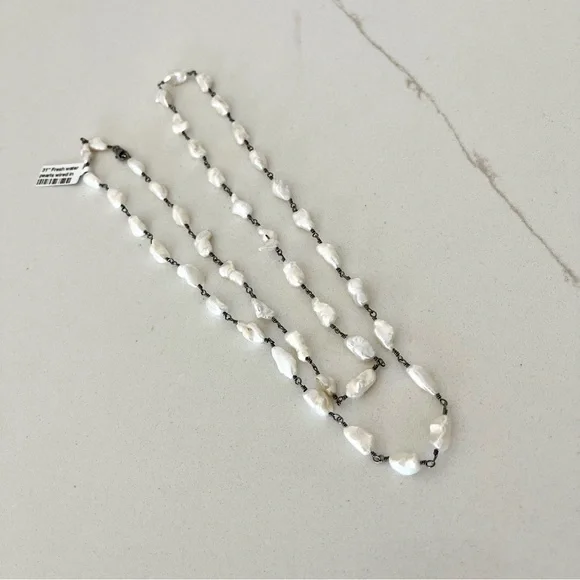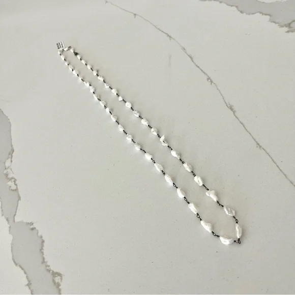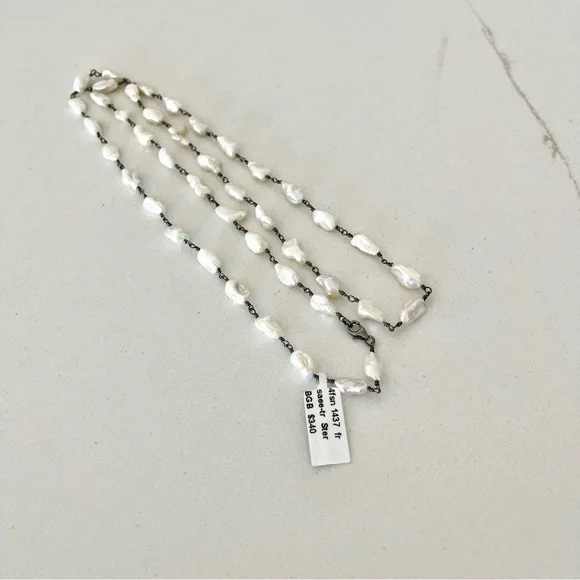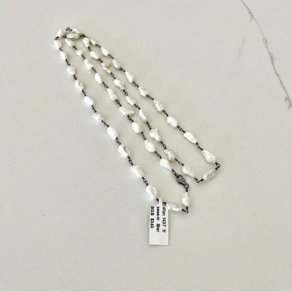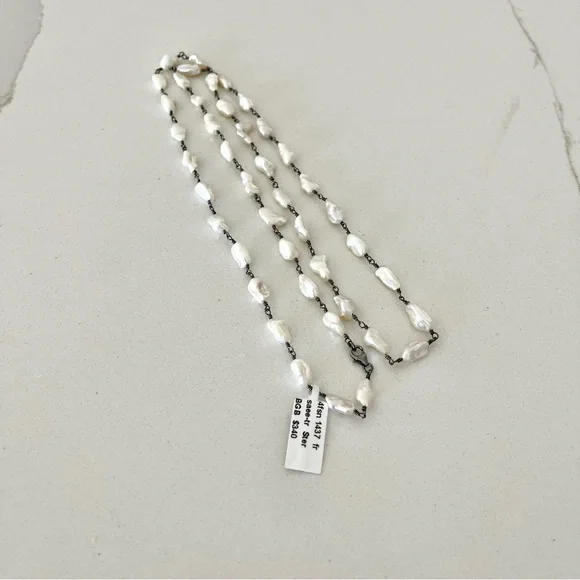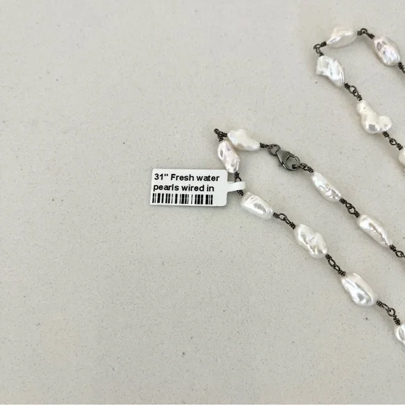 One of a kind Freshwater Pearl necklace, (43) fresh water pearls, wired together with sterling silver black rhodiumed, pearls are 10mm long 5-6 mm wide, 31” in length, New with Tags.