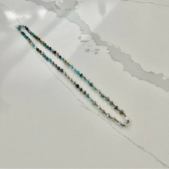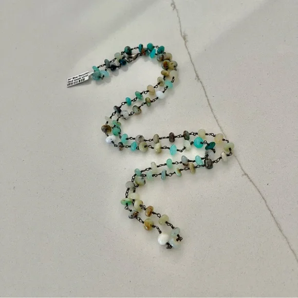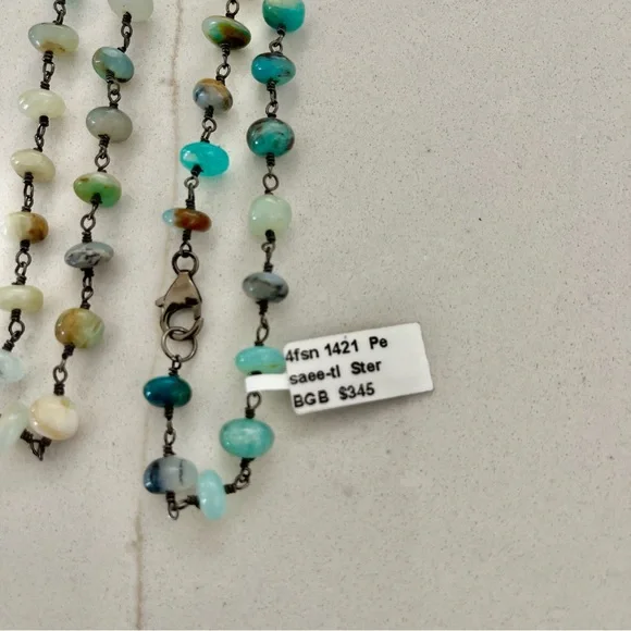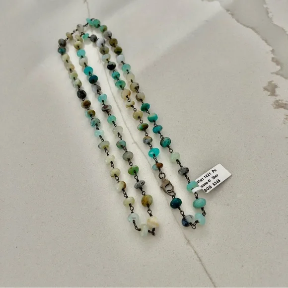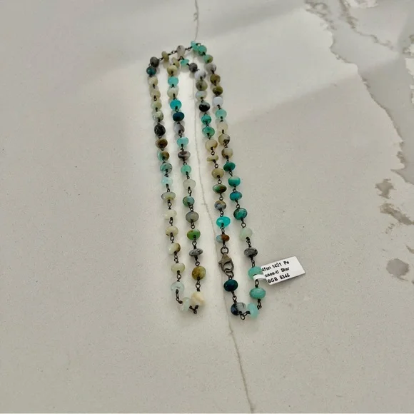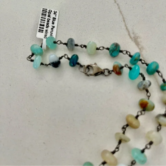 One of a kind Peruvian Opal beaded necklace, 34” in length, (74) 6mm peruvian opal beads, hand wired in sterling silver 925 black rhodiumed, sterling silver pelican clasp with jump ring, New with Tags.