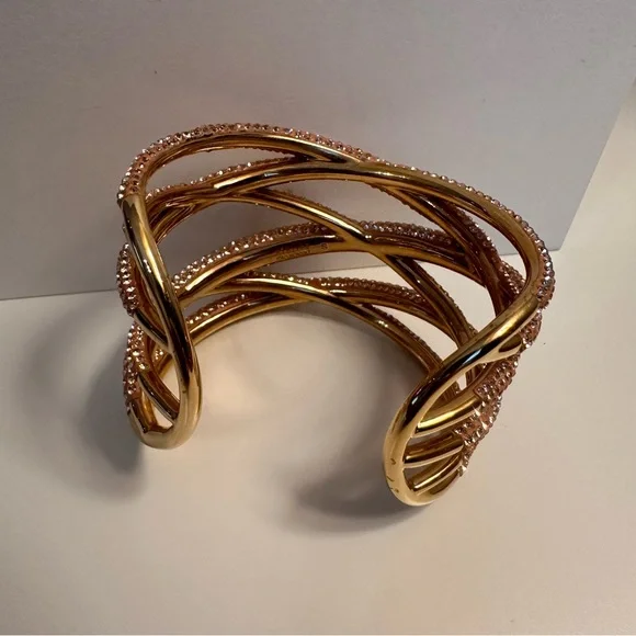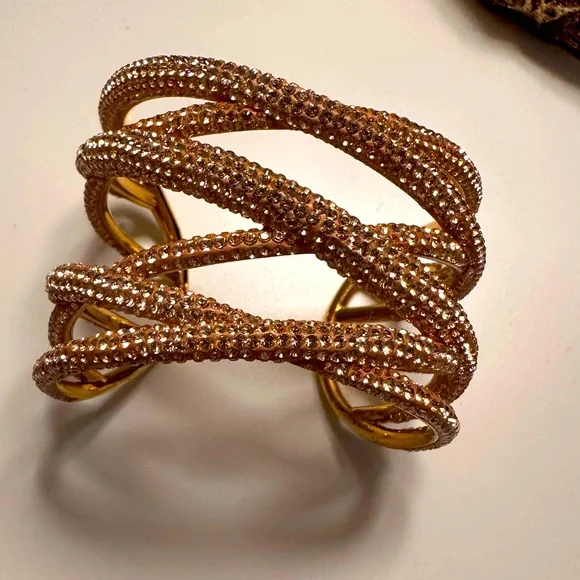 Swarovski crystal Atelier Tigris cuff bracelet. Gold-tone hardware with Swarovski crystals. Cuff style bracelet looks like three stacked crisscross bracelets. Make a statement...